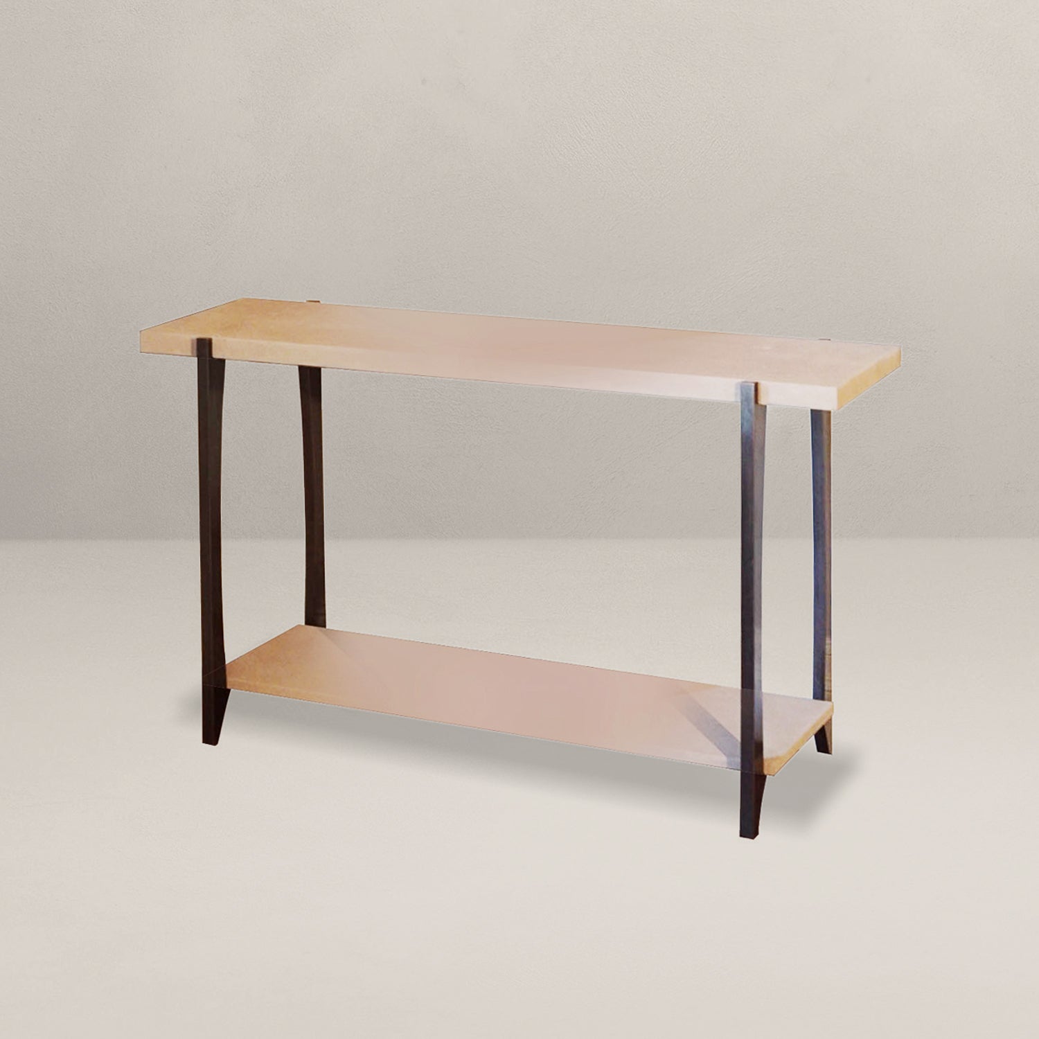 Characterised by its subtle curved antique brass legs, the Belvedere Console Table offers a contemporary and distinctive design. Seen here in sueded Shagreen it epitomises the timeless Simpsons aesthetic.