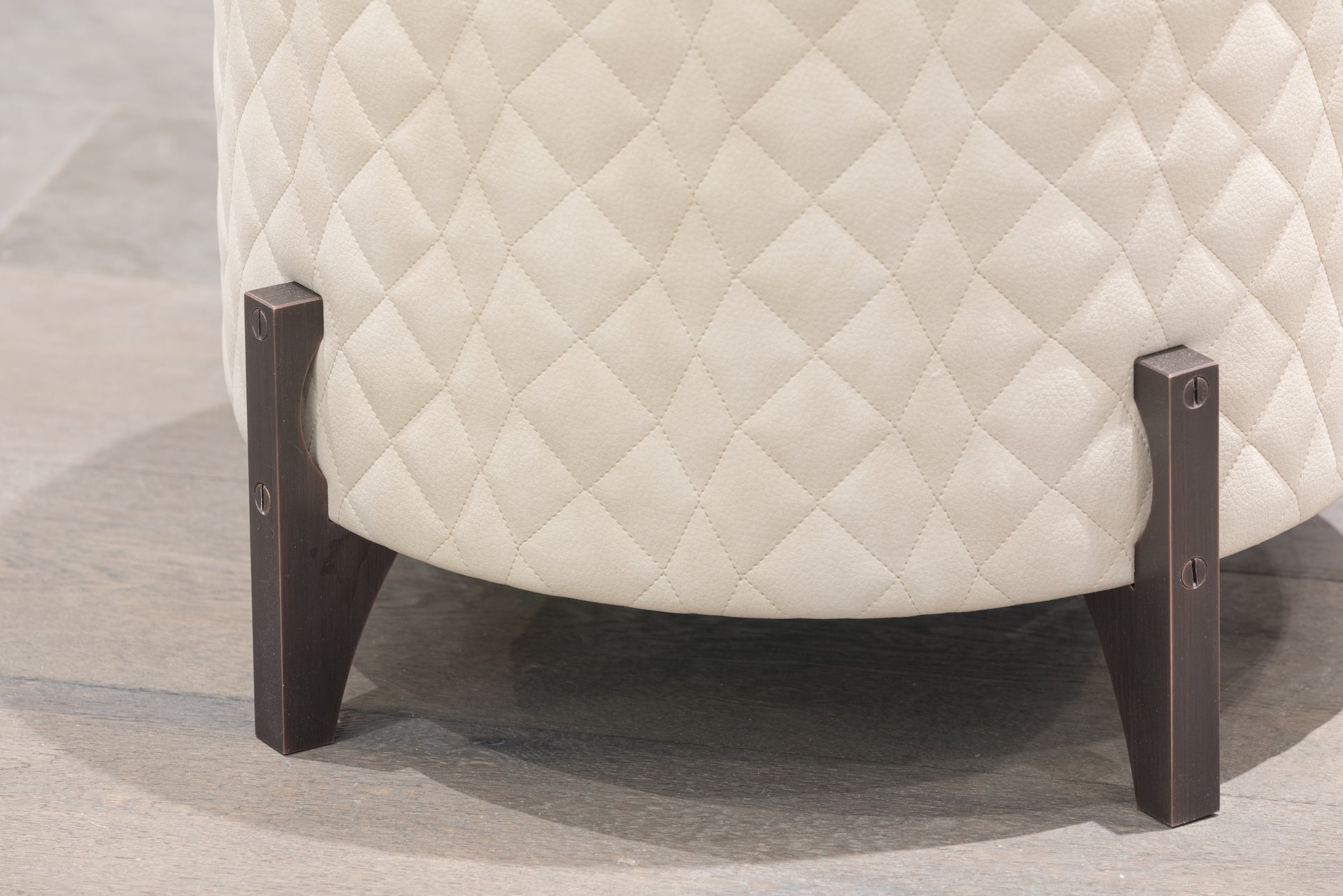 Featuring luxurious leather upholstery, the Belvedere Circular Stool offers a compact modern silhouette with hand crafted Antique brass feet. It is perfectly poised as a dressing table or dining stool.