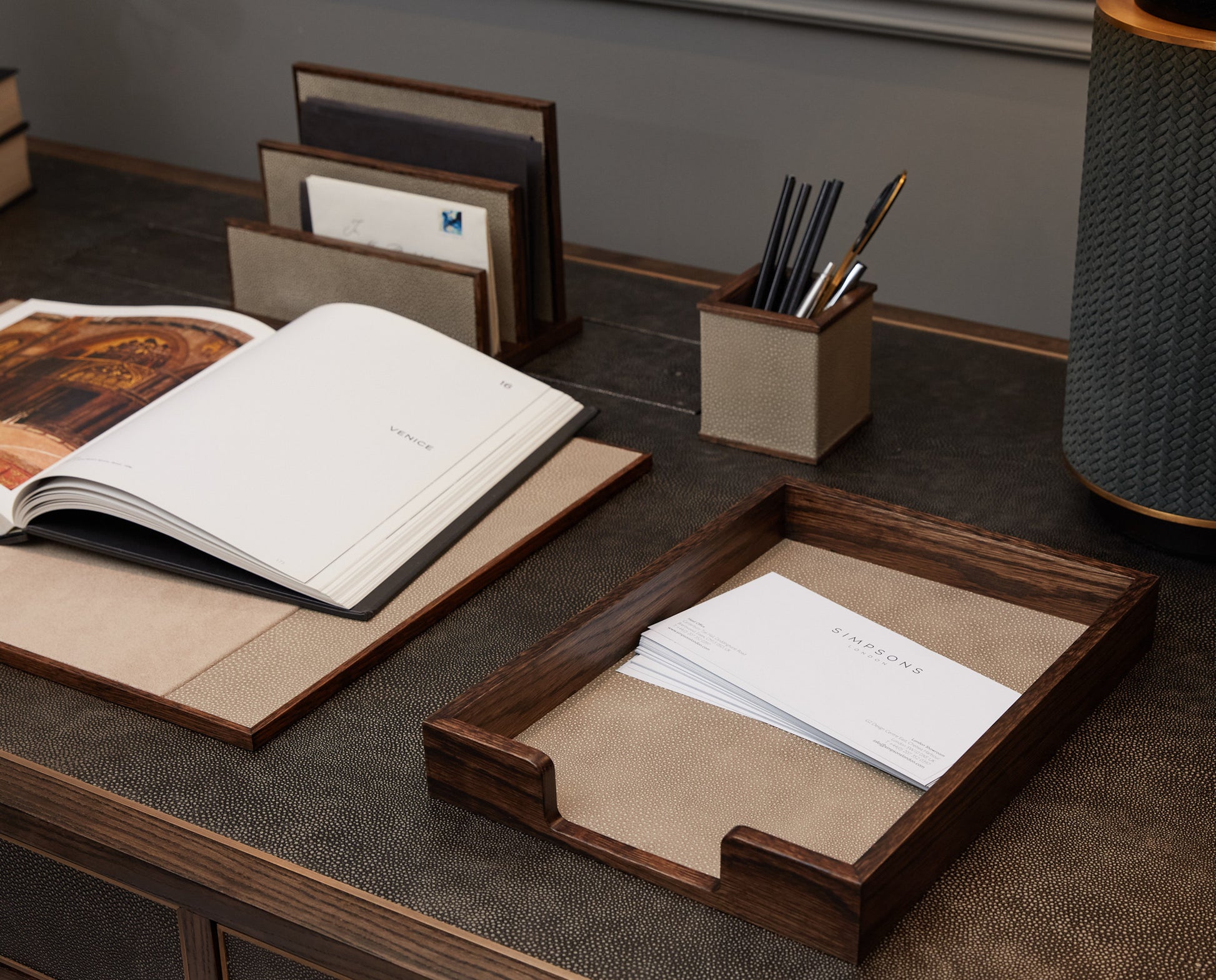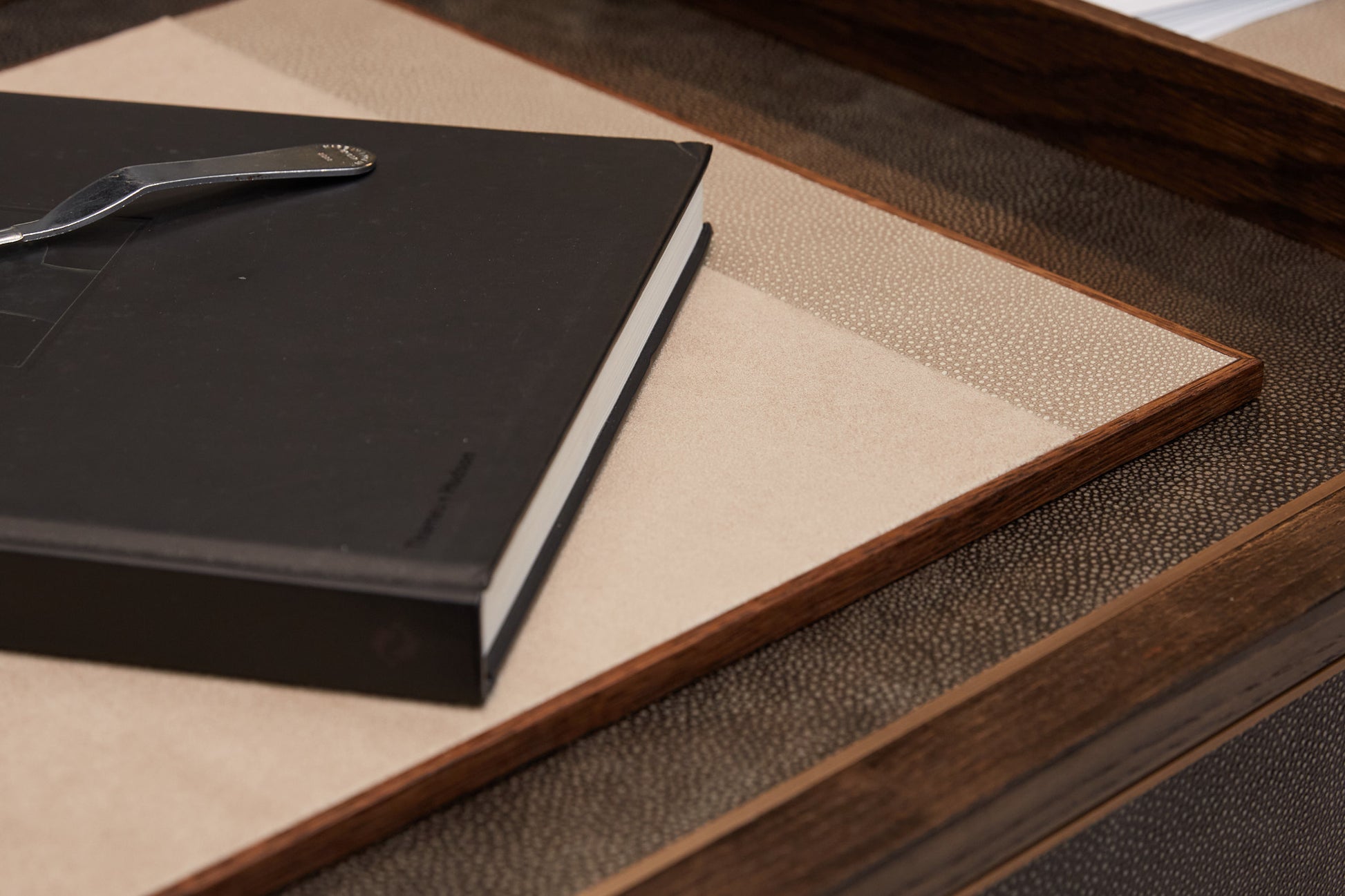 Our Blotter offers a luxury work surface for any desk or office as part of our Desk Collection. They are available in either a Smoke Shagreen and Dark Oak finish or Charcoal Shagreen with Dark Walnut finish and are sided in suede panels, offering an elegant desk writing and correspondence area.