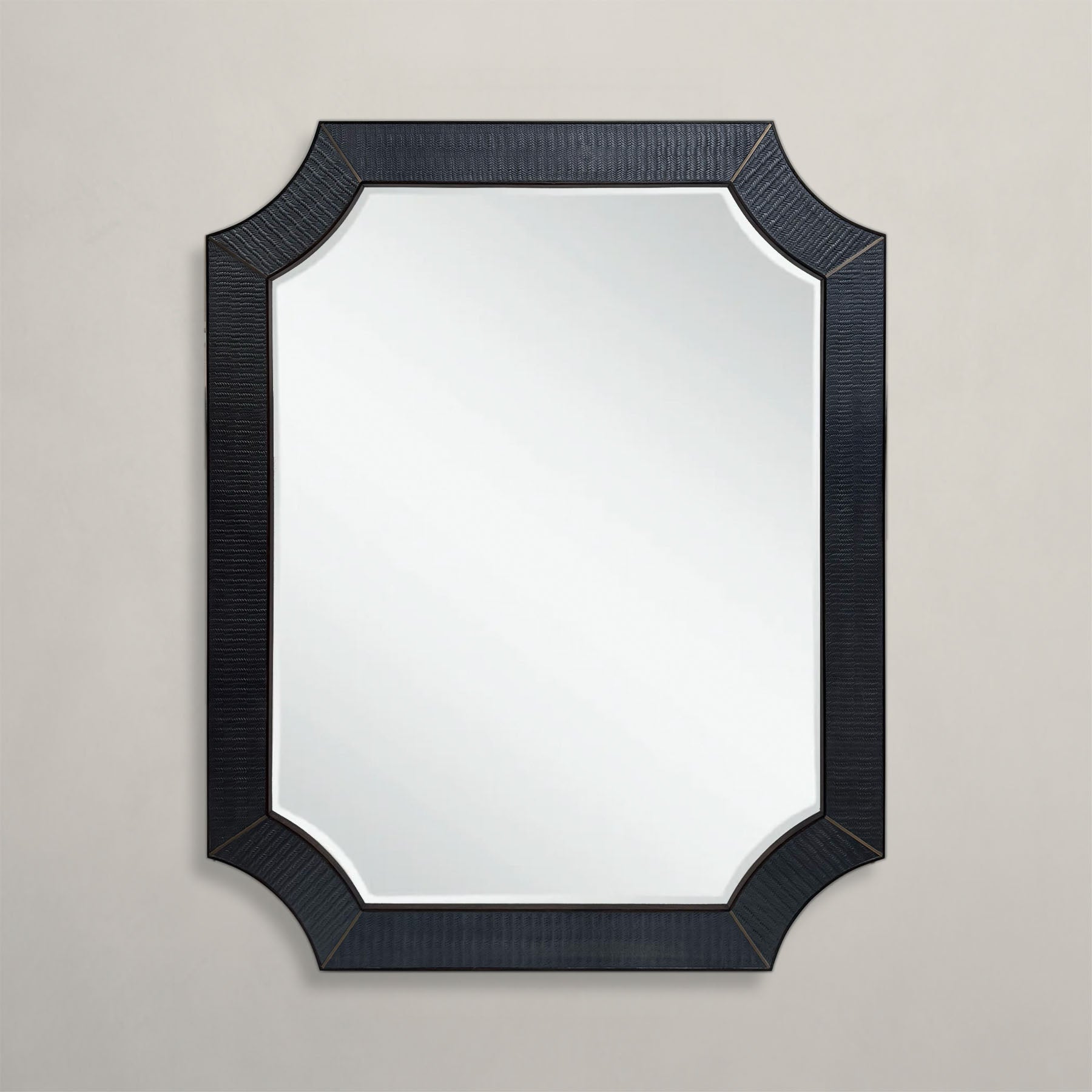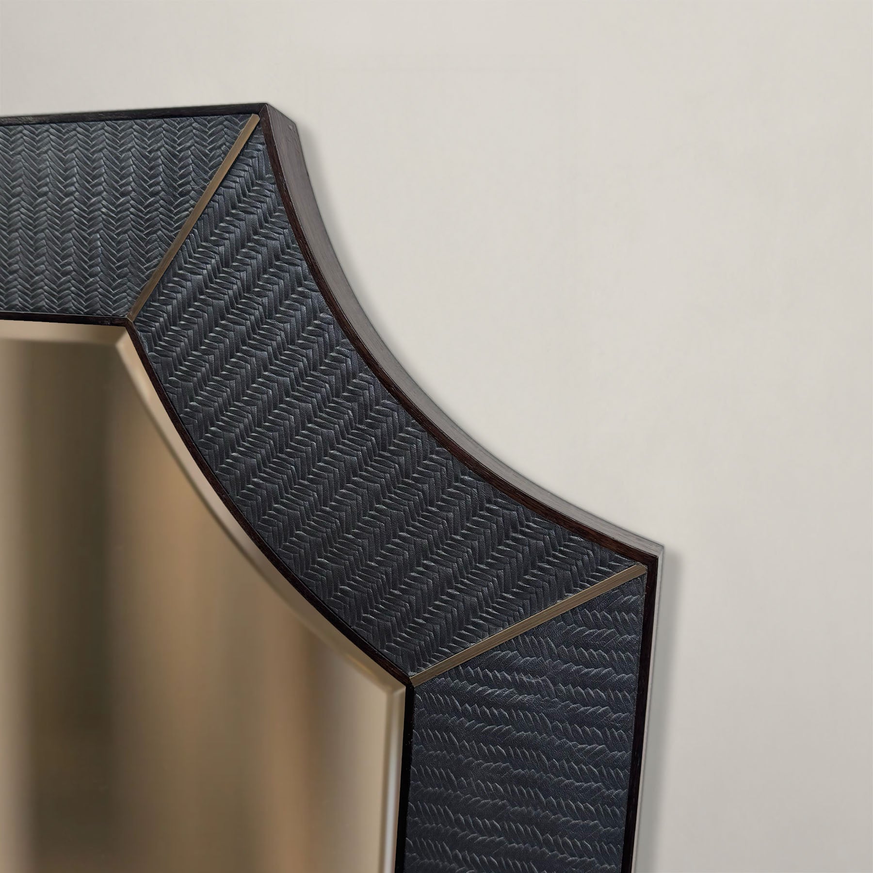 The elegant Burlington design with its scalloped corners features the Herringbone Petrol Blue leather surround, encased with dark walnut trim, antique brass details and a bevelled-edge mirror.