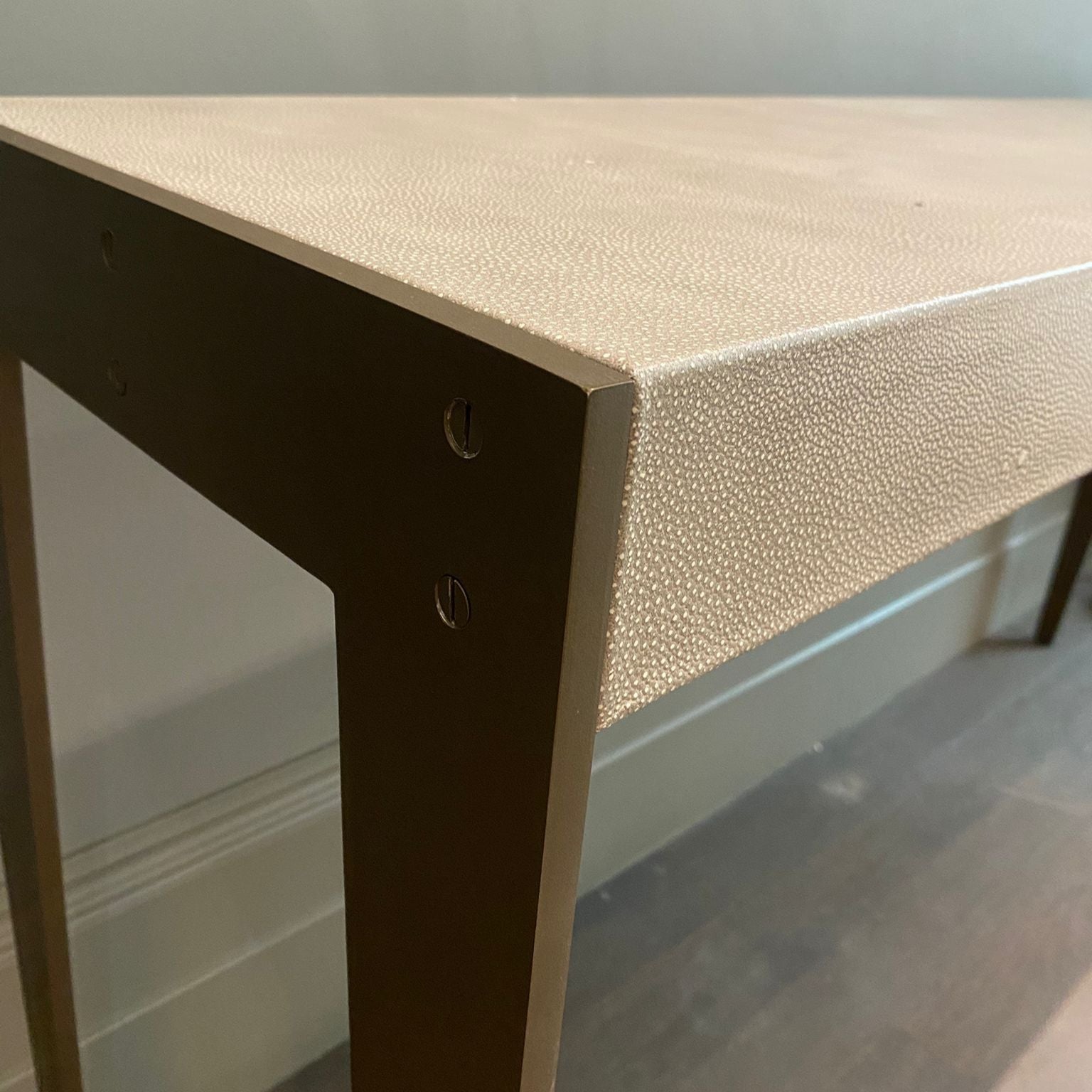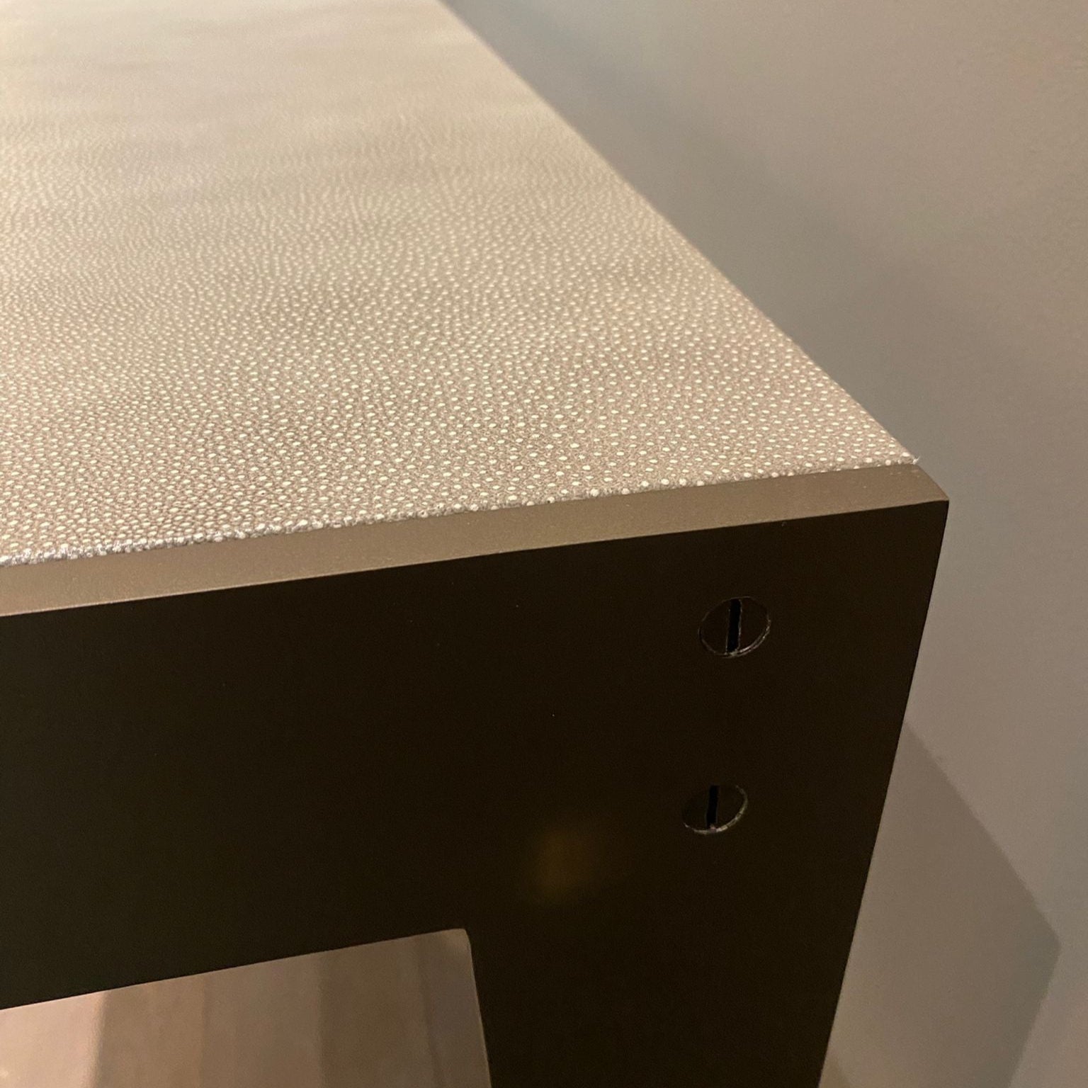 Expertly crafted with distinctive legs, the Byzantine Console showcases a contemporary design that adds a touch of sophistication to any space. This console is handmade with woven plum sueded leather, creating a unique and luxurious piece. Elevate your home with this one-of-a-kind console.