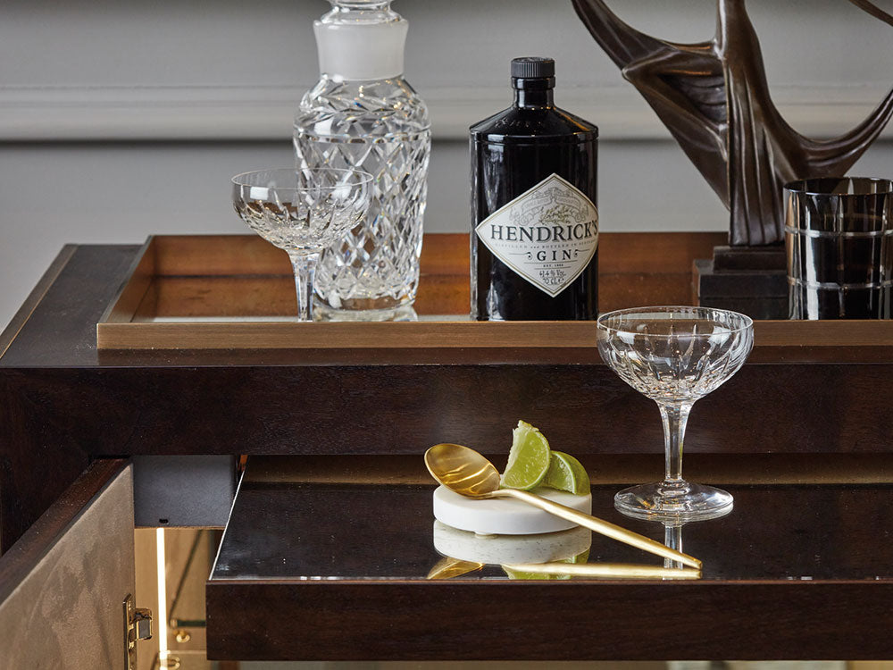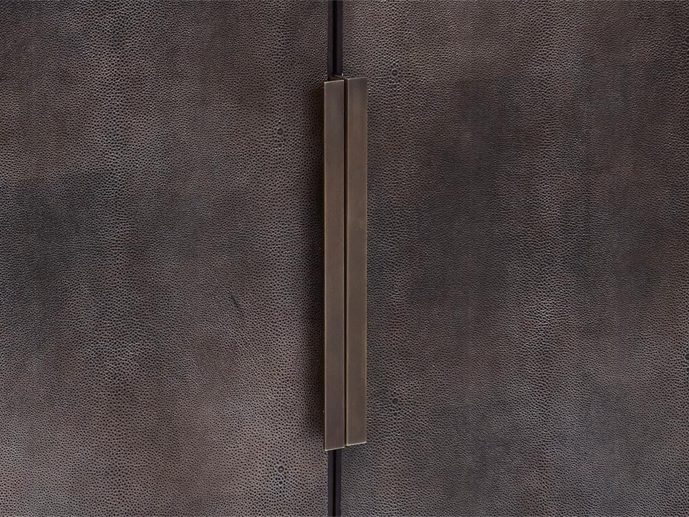 The unique Byzantine Drinks Cabinet is both slender and modern. It combines elegant antique brass accents with a dark walnut wooden frame and textured Shagreen leather. Double doors open to provide a concealed cocktail preparation shelf and additional adjustable glass shelving with interior lighting for display items.