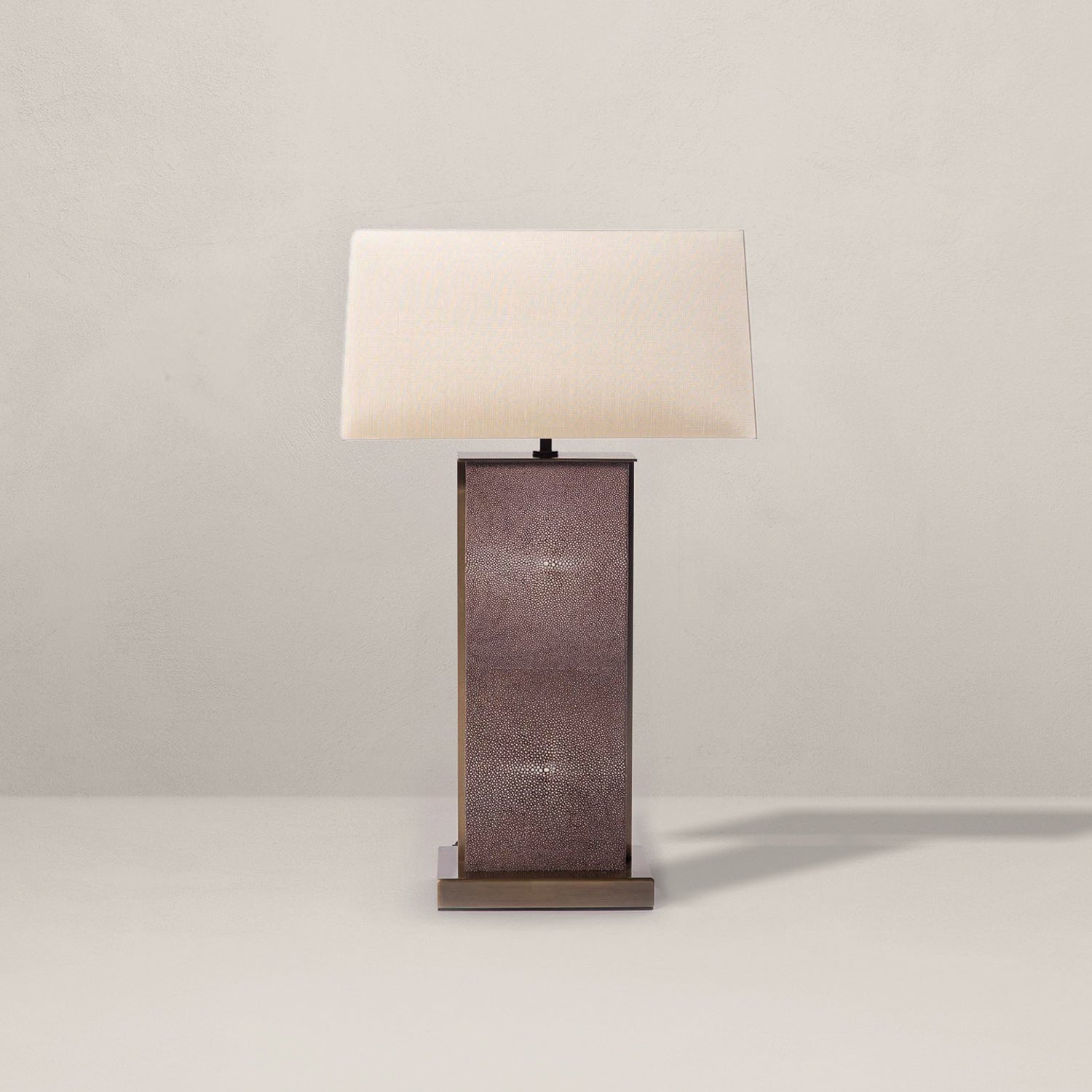 The Byzantine Table Lamp combines an elegant antique brass base and detailing featuring genuine Shagreen leather, for a distinctive luxury finish.