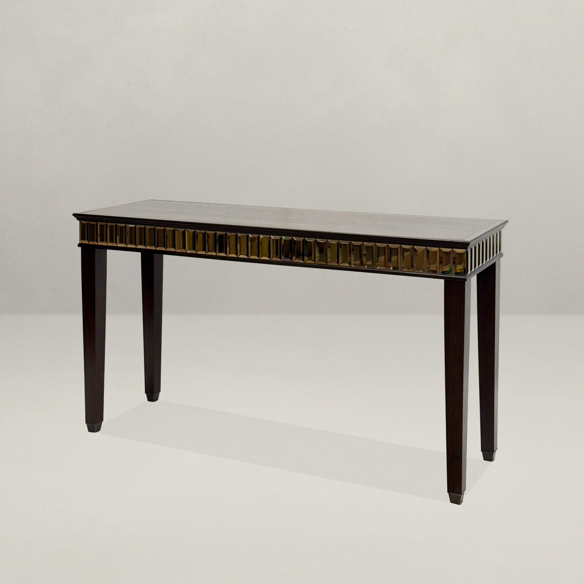 Add a touch of luxury to your home with our hand crafted Tiffany Console. Featuring an elegant dark walnut finish and antique brass detailing, this classic design is sure to make a statement. The tiffany bevelled mirror tiles add a touch of sophistication, making this console a true standout piece.
