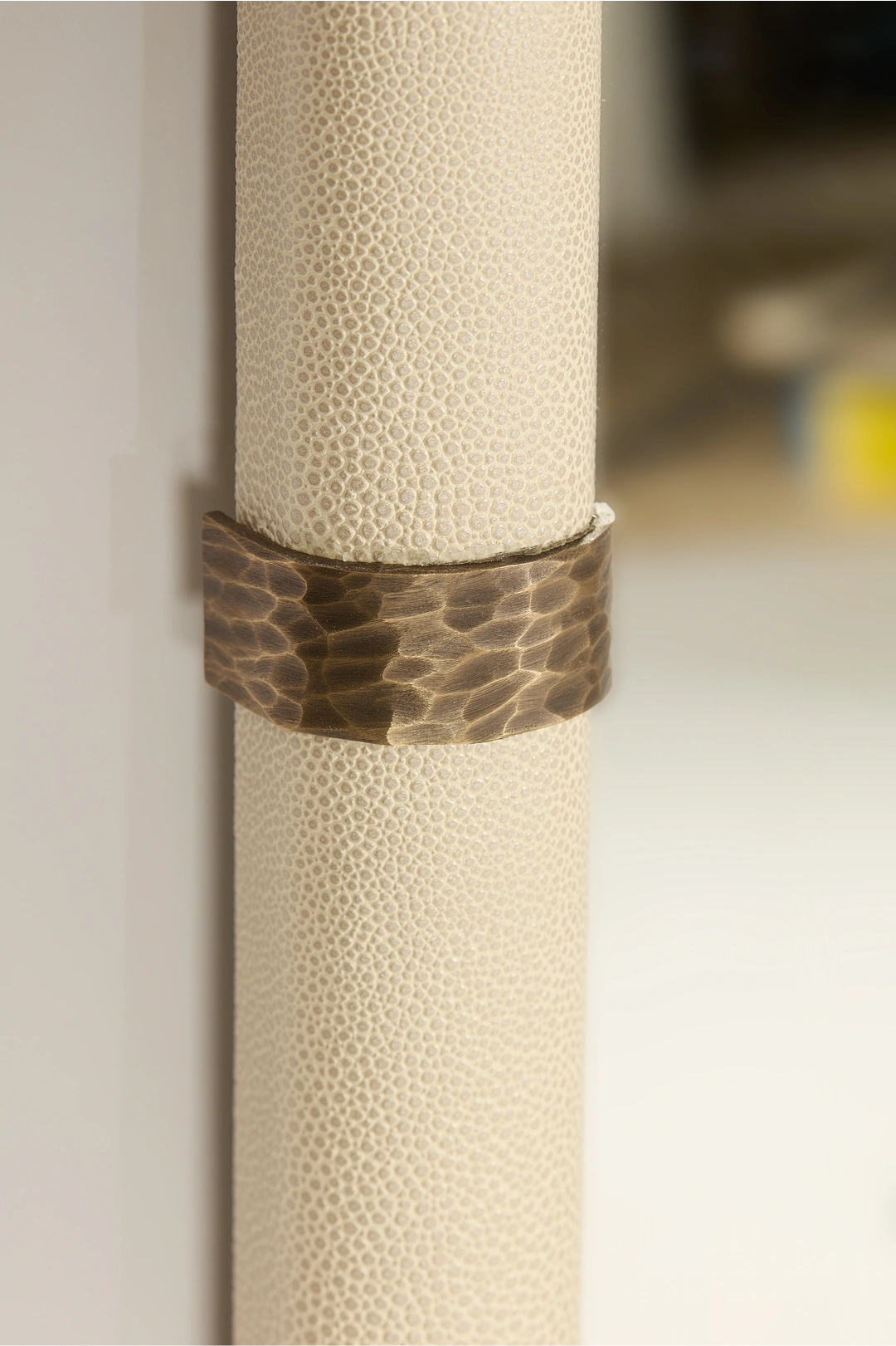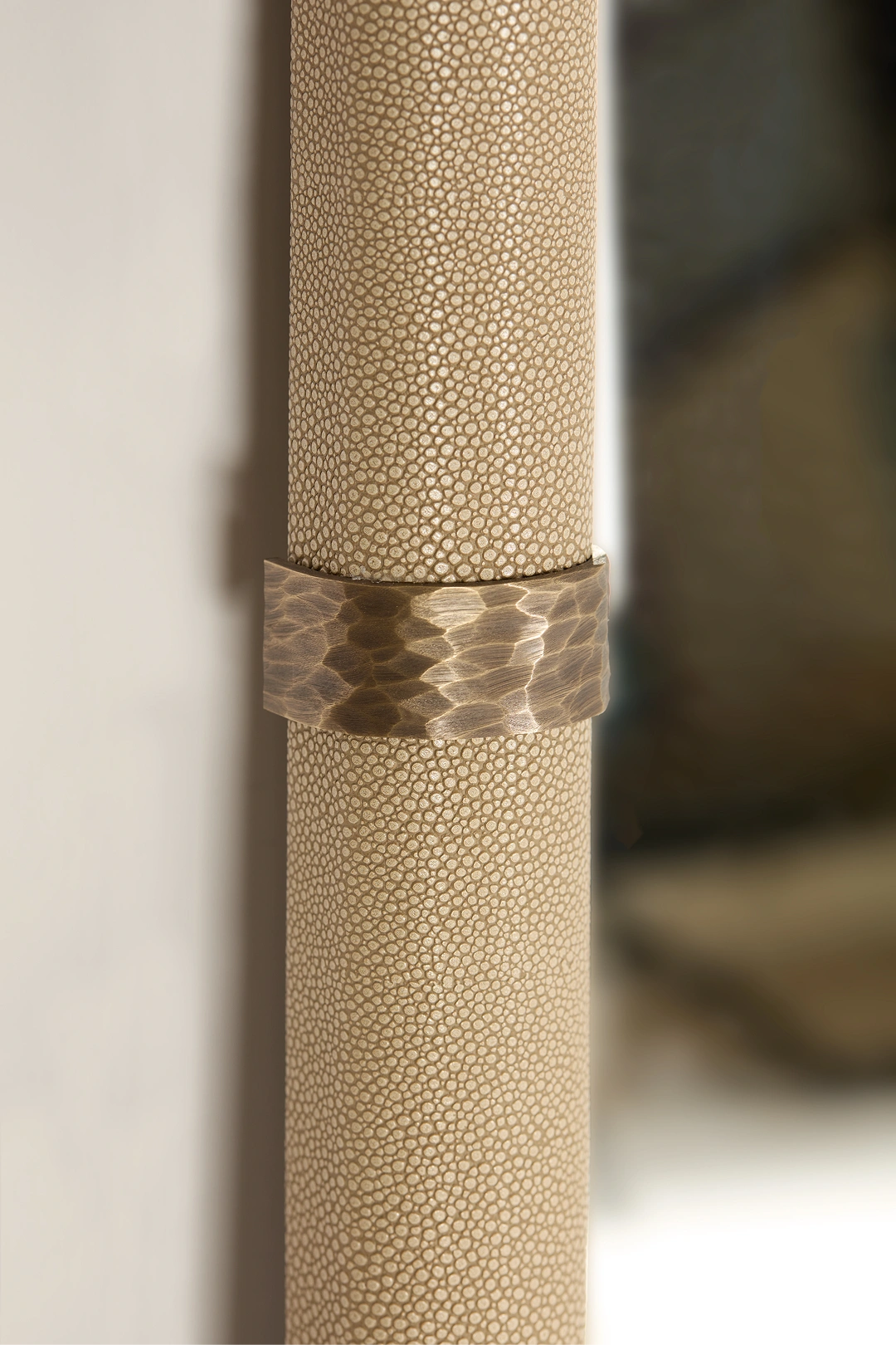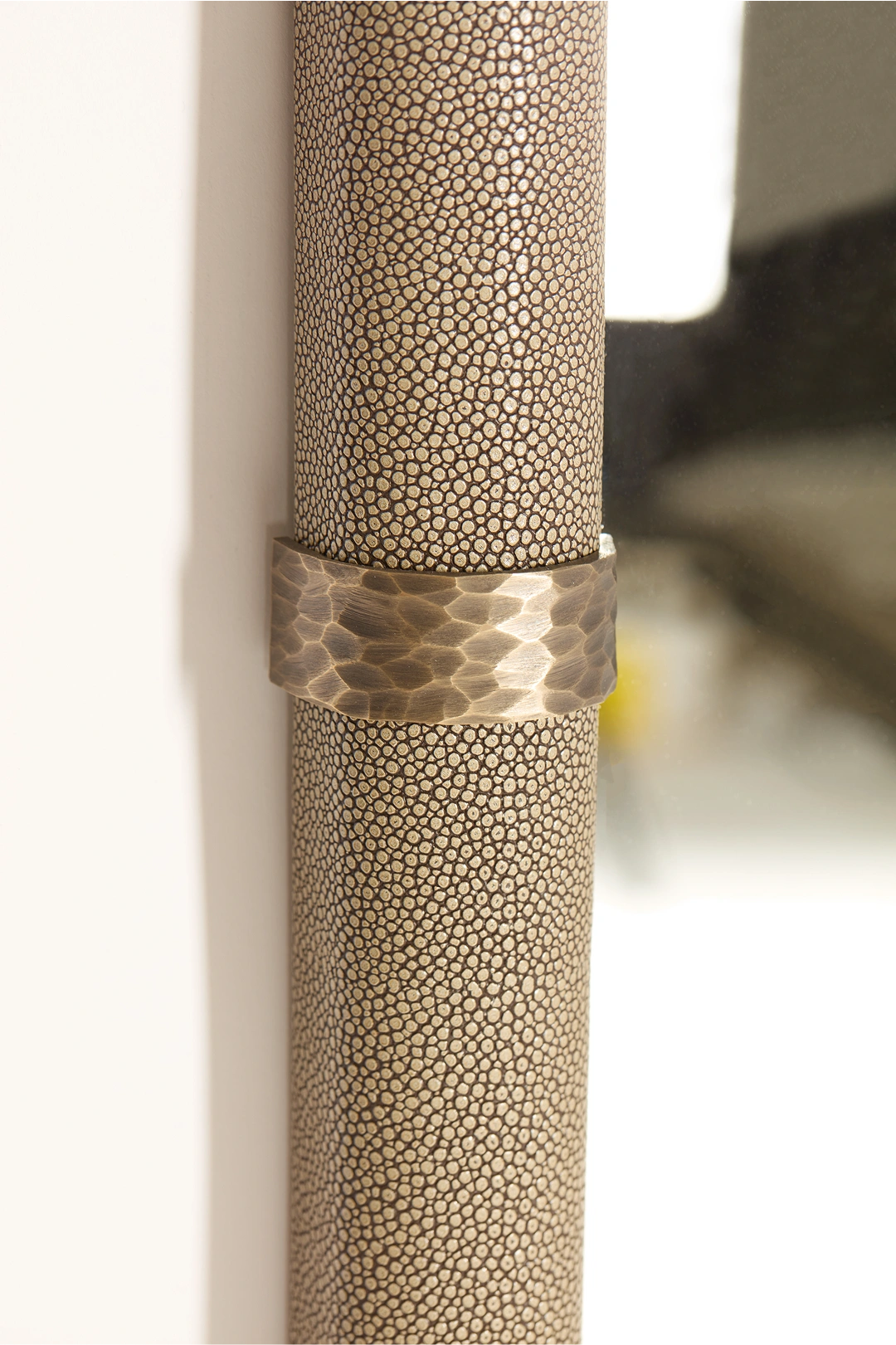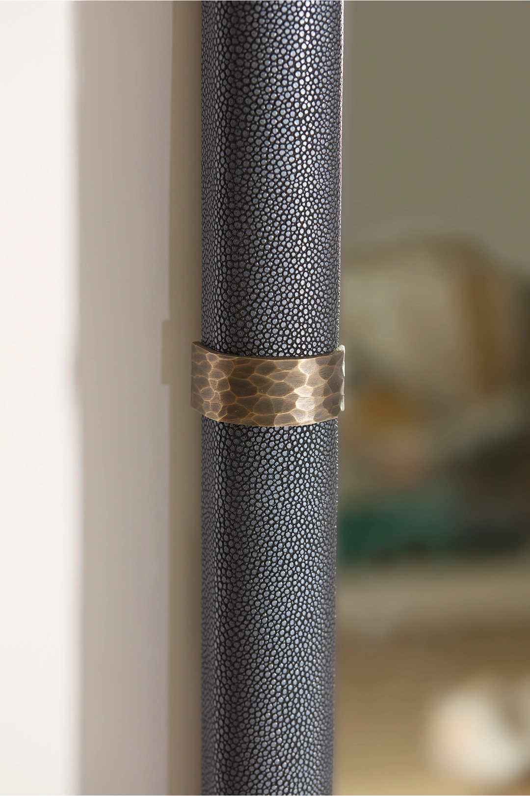 Part of the Ready to Hang Collection, the Colombia mirror combines refined British craftsmanship with accessible solutions for every project. Offered with antique brass feathered details and wrapped in your choice of Shagreeen.