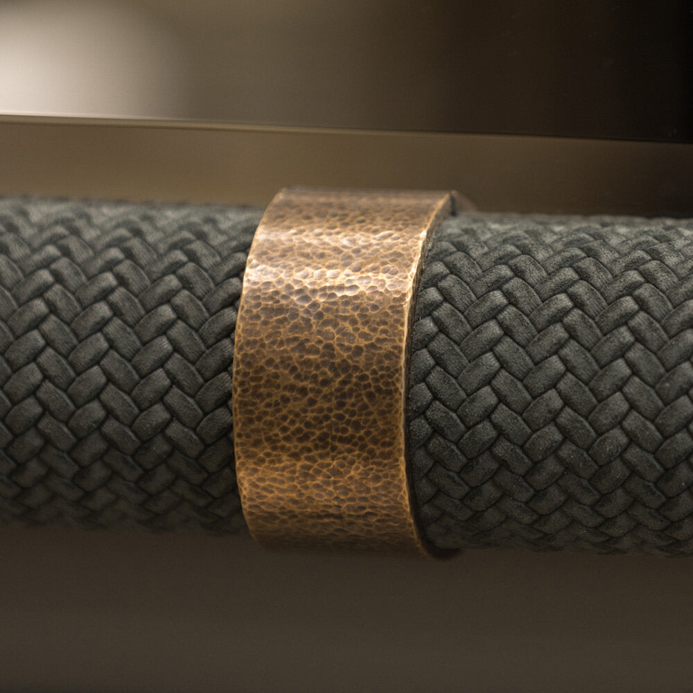 The Columbus Mirror combines a luxurious curved profile enveloped in a herringbone sueded leather and complemented by hand-hammered antique brass details, capturing the Simpsons aesthetic with beautiful textures and highlighted details.