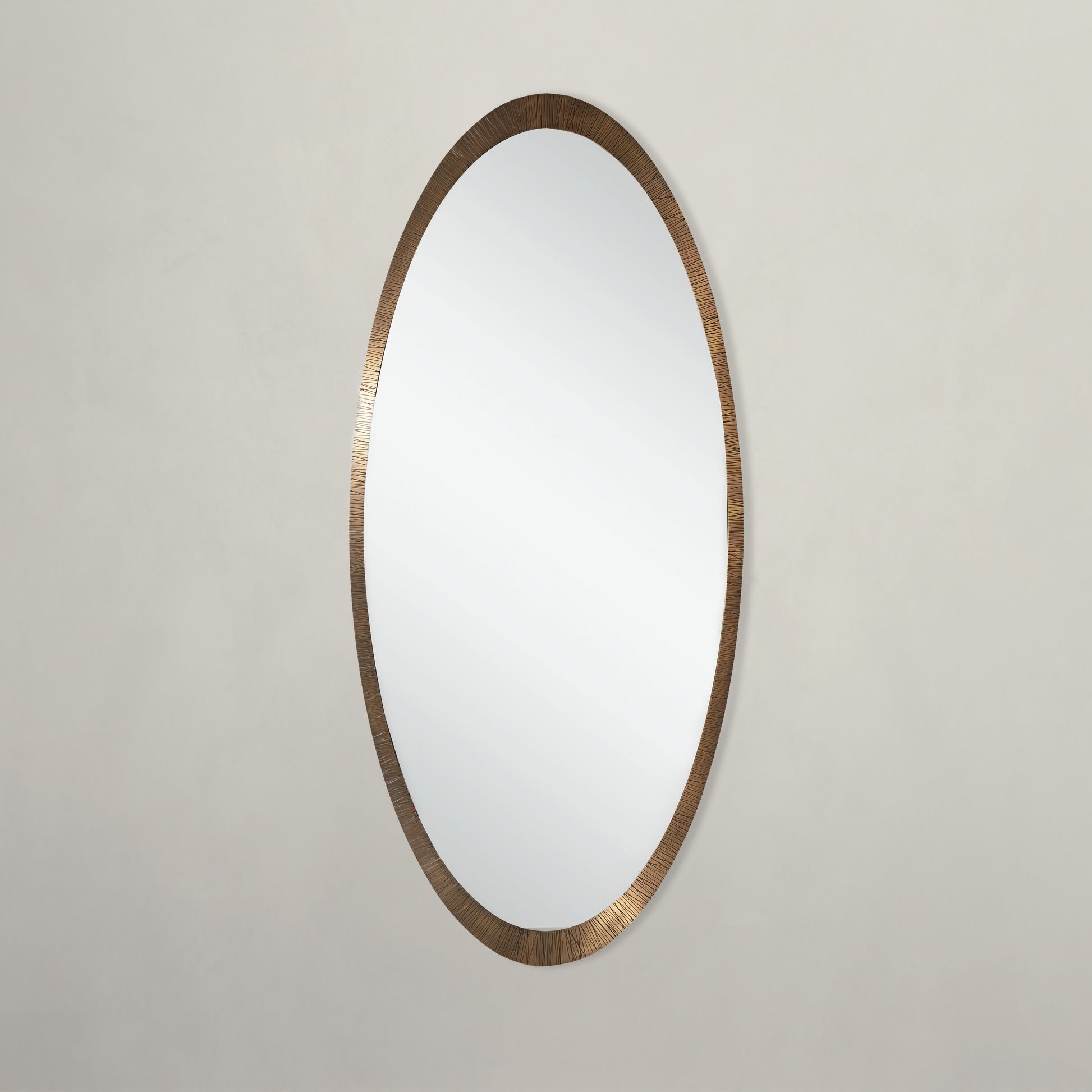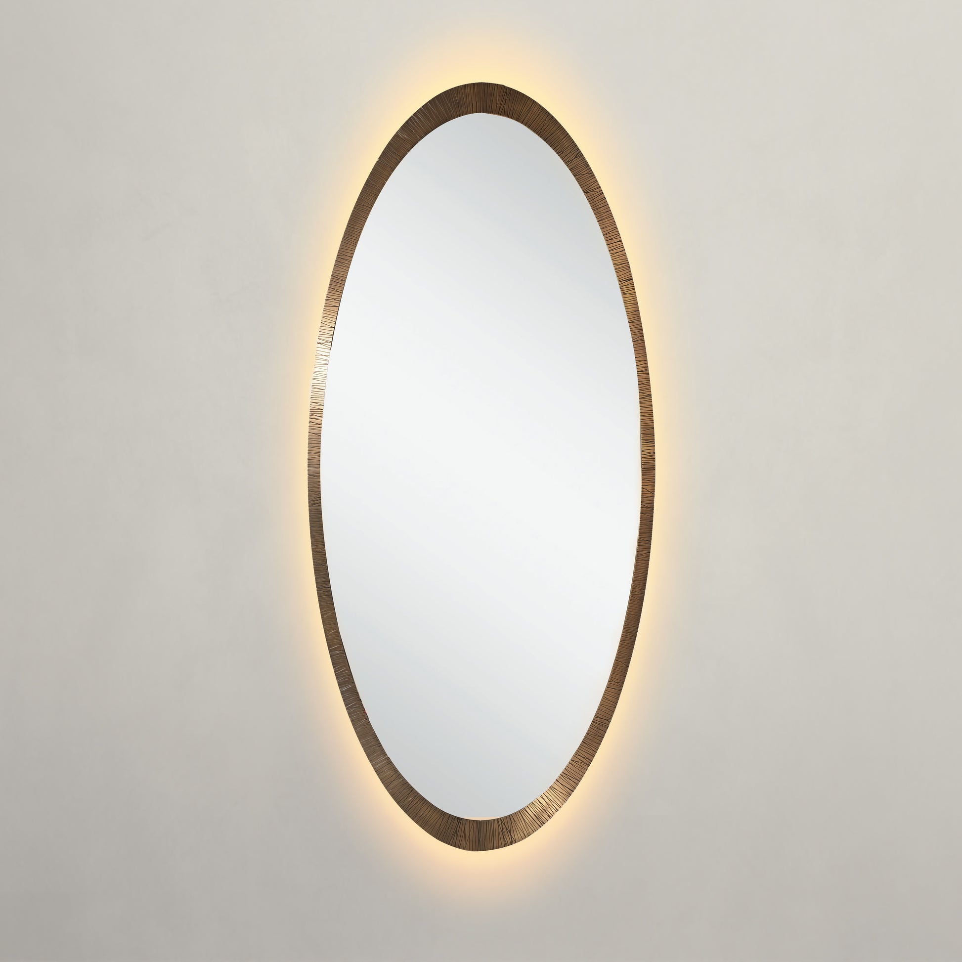 The Como Mirror features a striking oval antique brass frame with hand-grooved details surrounding a silver glass mirror, creating a contemporary aesthetic. It is available with or without warm backlighting.