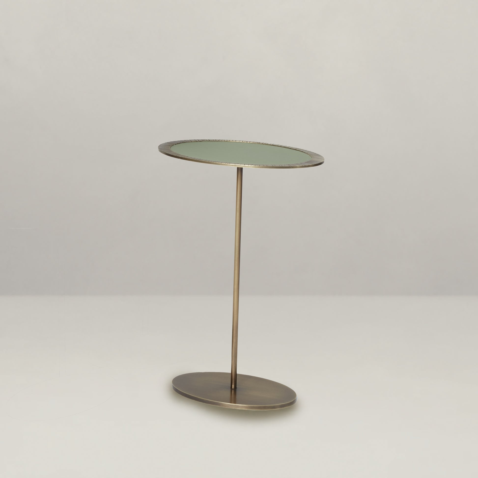The Como side tables offer elegant simplicity with varied heights and finishes. This side table is available with grooved antique brass details and thyme green leather.