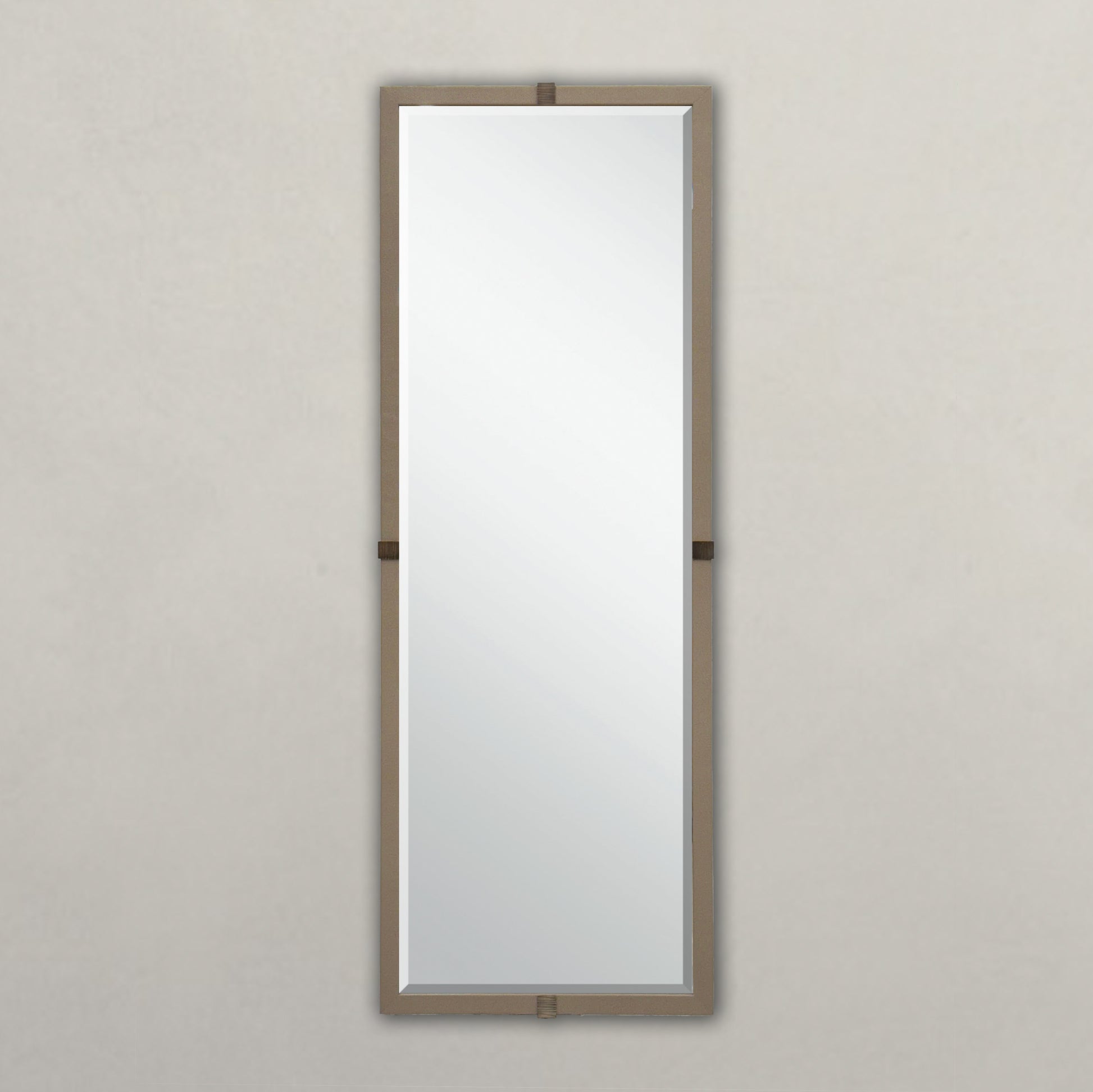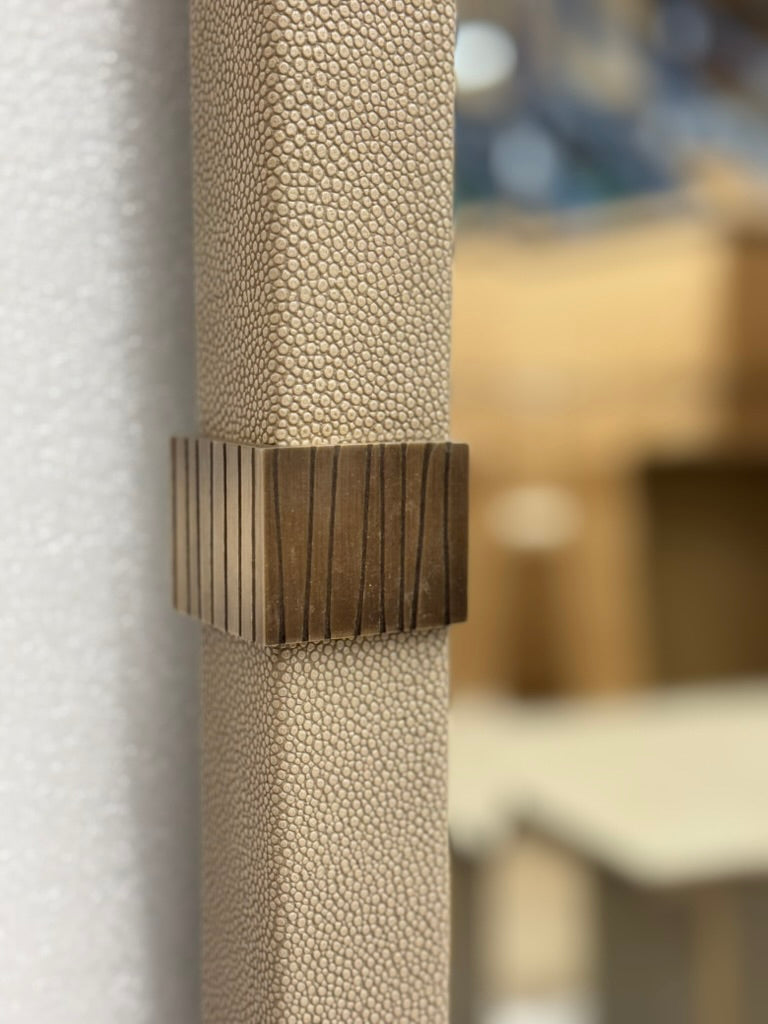 The Contract Mirror, part of our modern and timeless contract collection, features antique brass cuffs with etched detailing and a fog faux vinyl shagreen leather frame. Its centre bevelled mirror adds a touch of elegance and sophistication to any space. Suitable for any environment, this mirror is a perfect addition to your home or office.