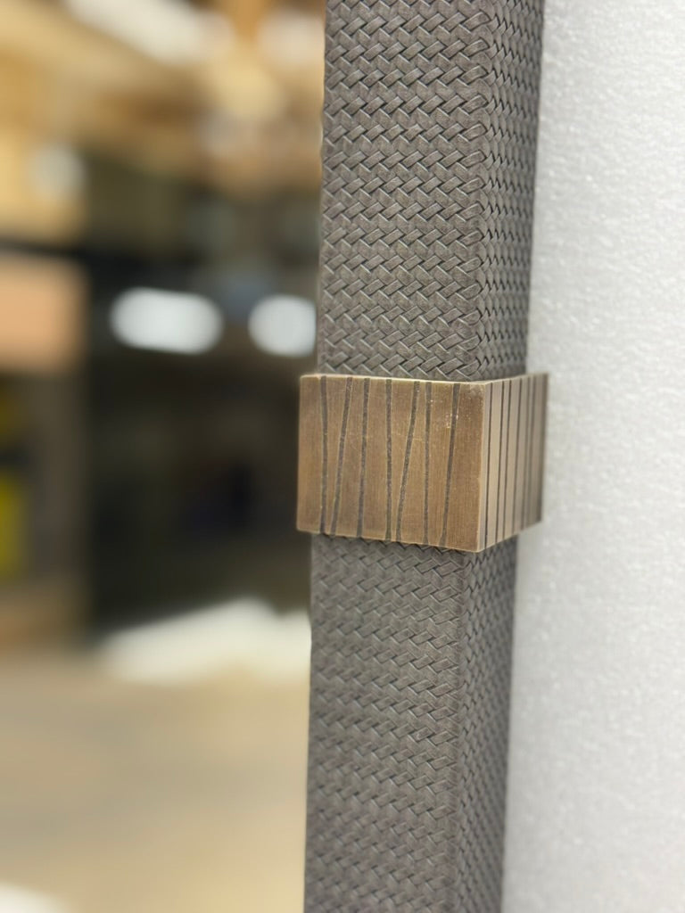 The Contract Mirror, part of our modern and timeless contract collection, features antique brass cuffs with etched detailing and a charcoal woven leather frame. Its centre bevelled mirror adds a touch of elegance and sophistication to any space. Suitable for any environment, this mirror is a perfect addition to your home or office.