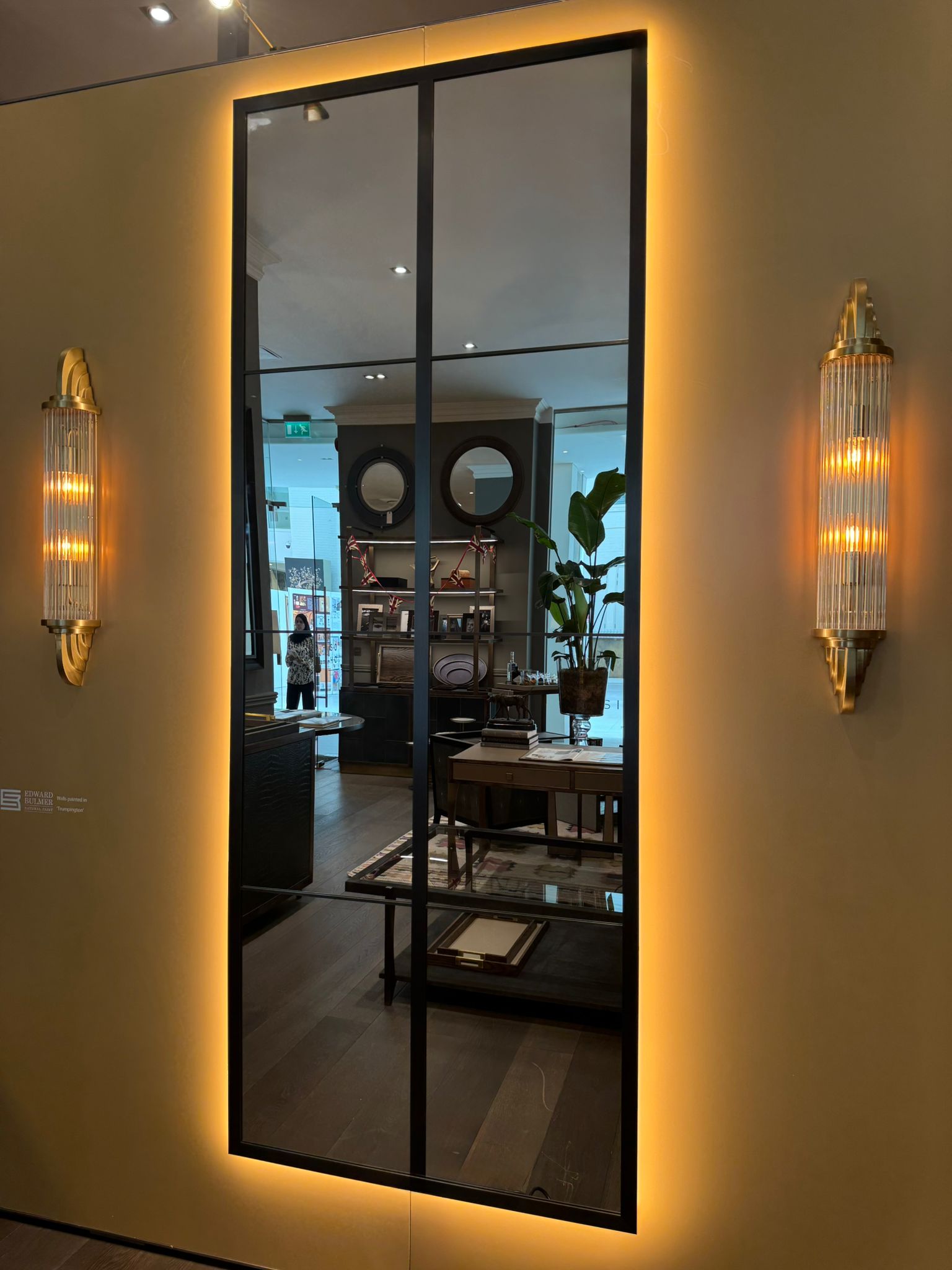 This elegant mirror showcases a hand-finished bronze Crittall-style frame, paired with a silver mirror and a concealed LED lighting surround. Featured at WOW!House 2025.