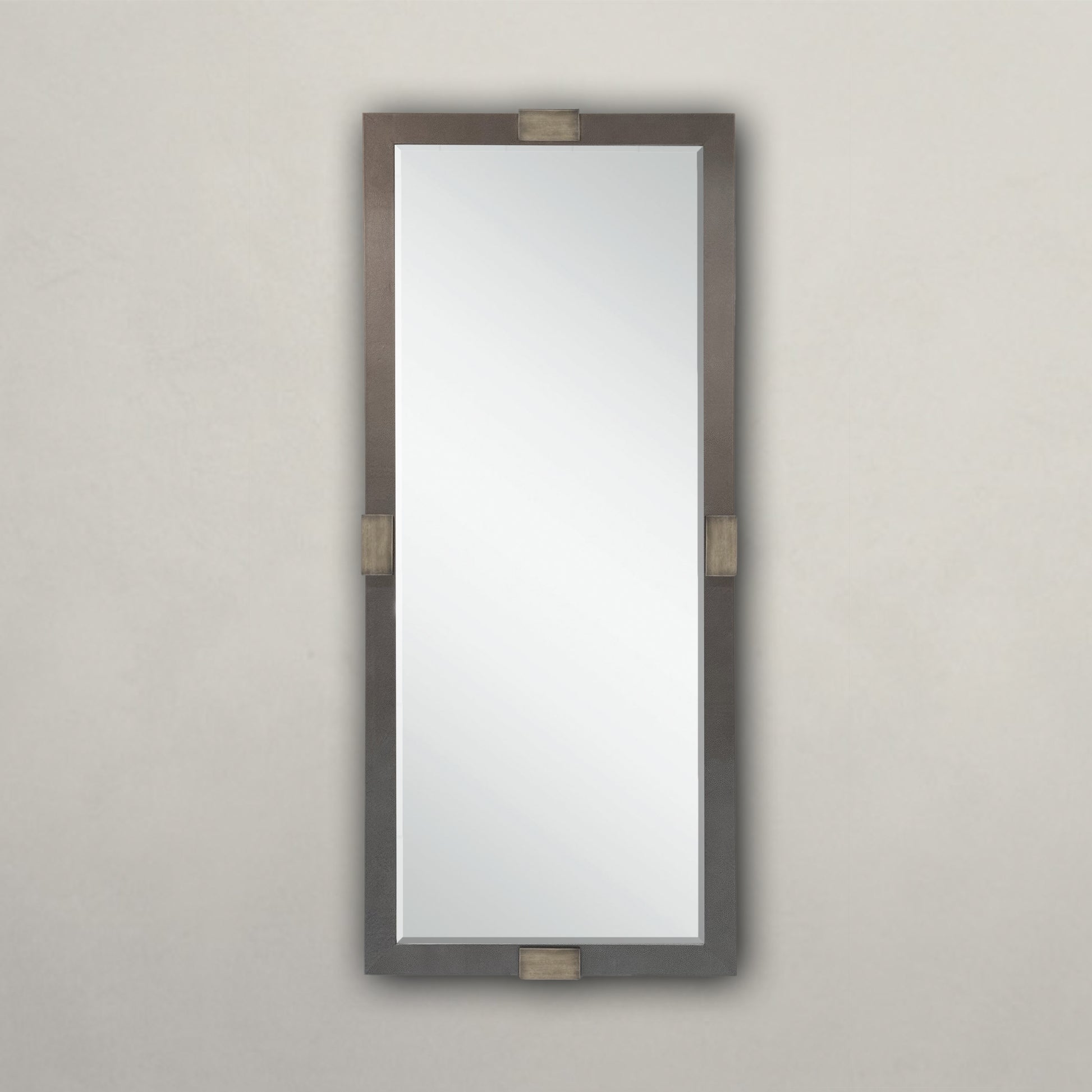 Add a touch of sophistication to your home with the Drake Mirror. Made from expertly hand crafted grey shagreen leather and accented with antique brass details, this statement piece is not only visually stunning but also functional with its dressing mirror and centre bevelled design. Elevate your interior with this elegant and timeless addition.