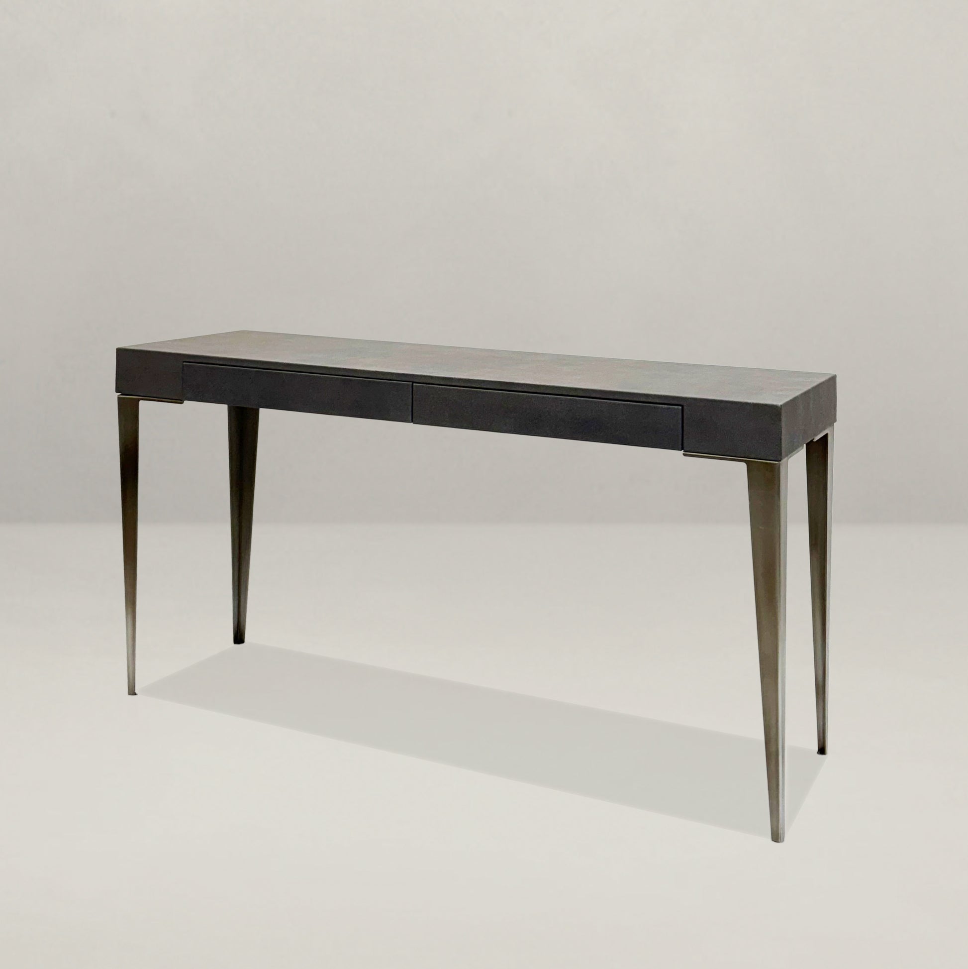 The Harvard Console features two drawers for convenient storage, wrapped in luxurious charcoal shagreen leather and supported by elegant antique silver legs. Elevate any space with this sophisticated and stylish piece.