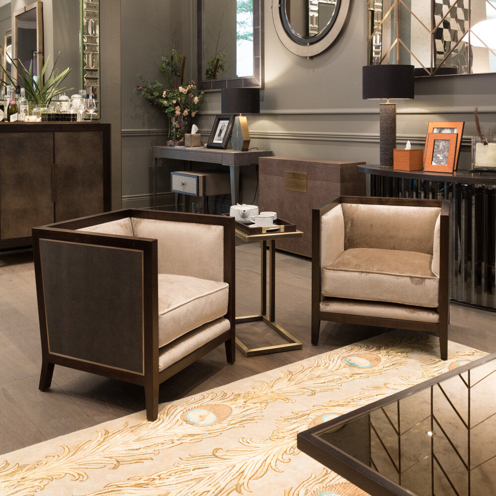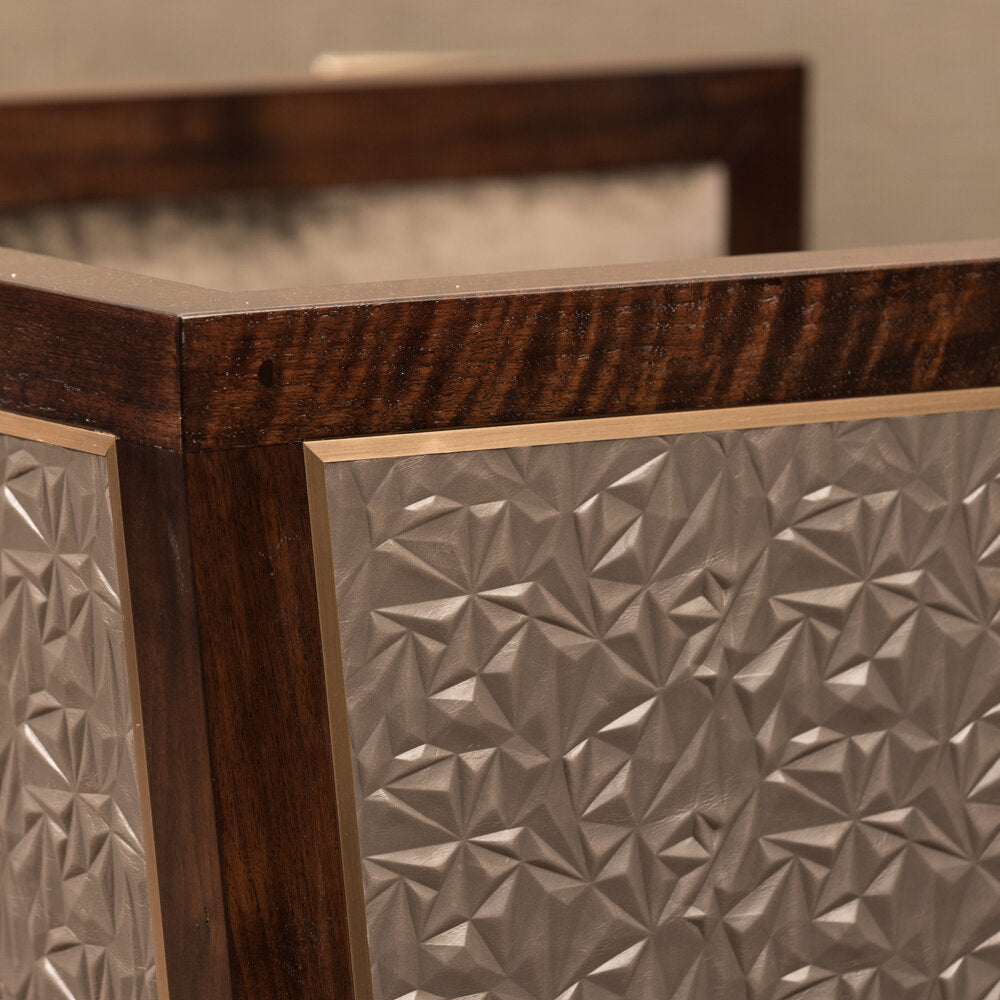 The refined Hector Chair offers a low and compact profile. The dark walnut frame is paired with antique brass metal inlay and exterior panels upholstered in orange croc leather. Soft velvet upholstery and padded back and sides provide comfortable seating offering a distinctly Simpsons aesthetic.