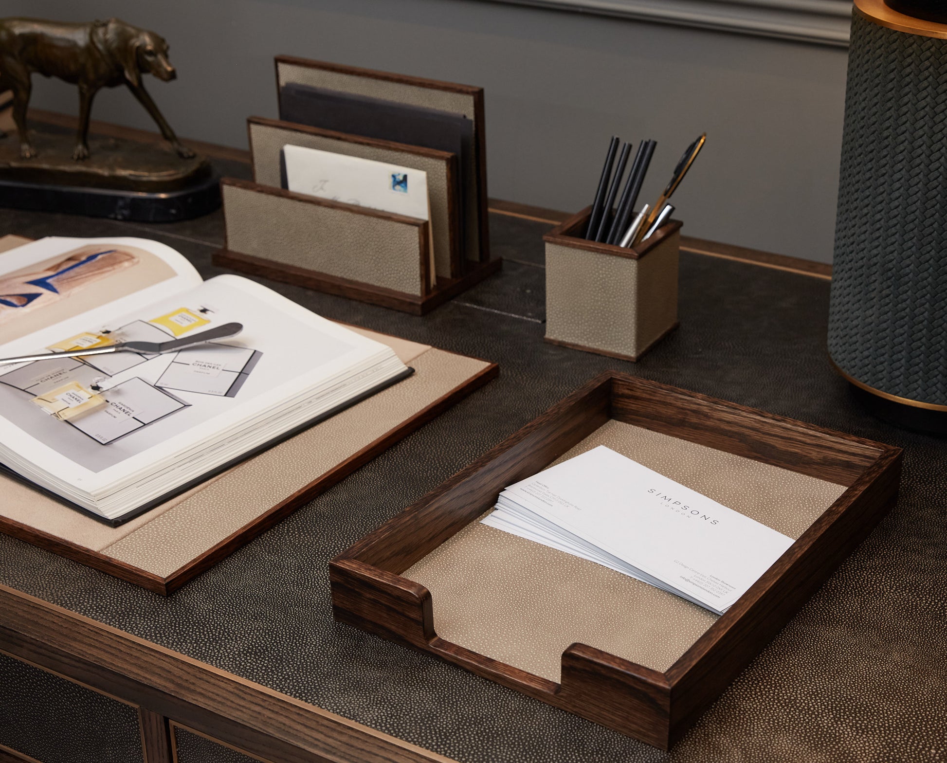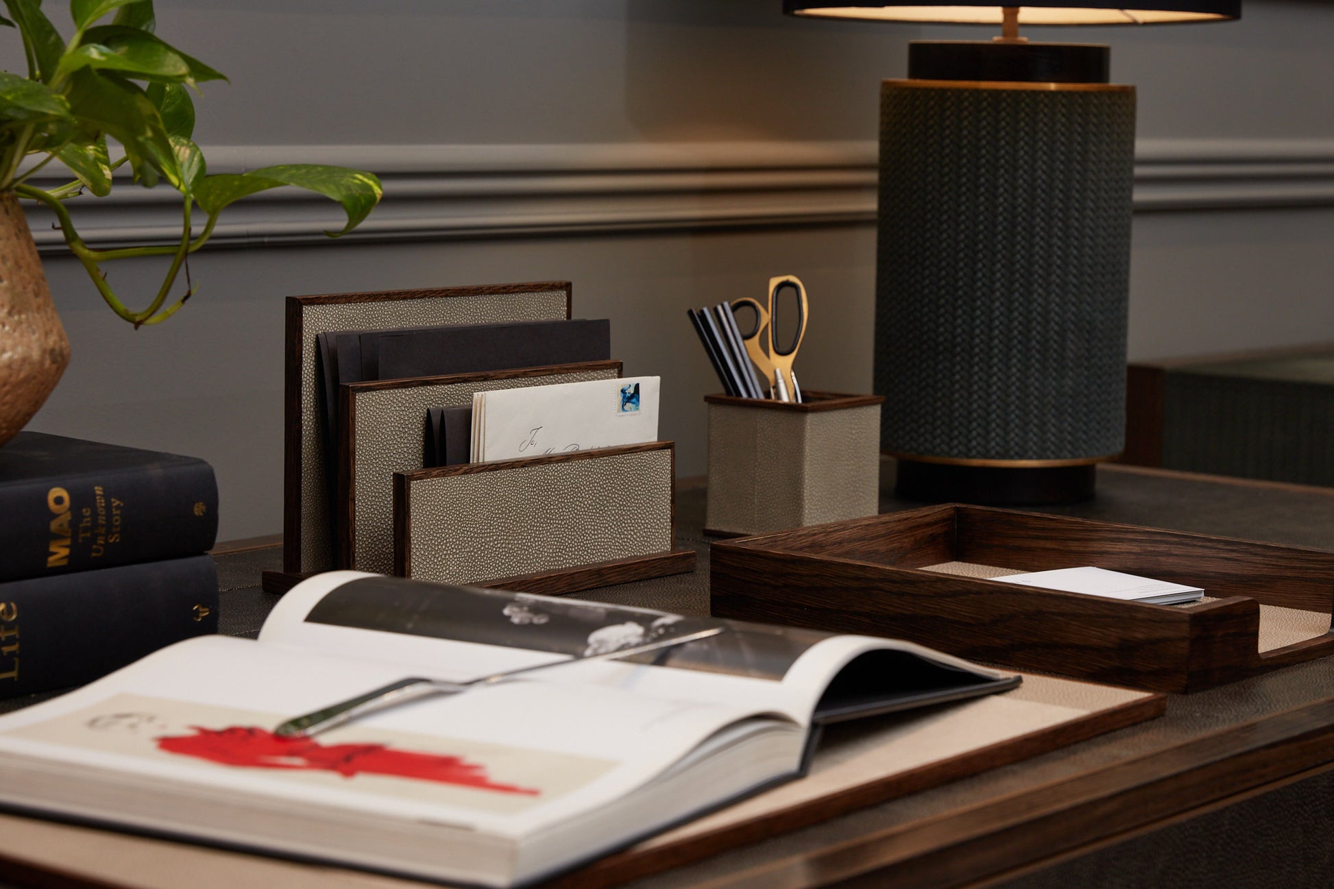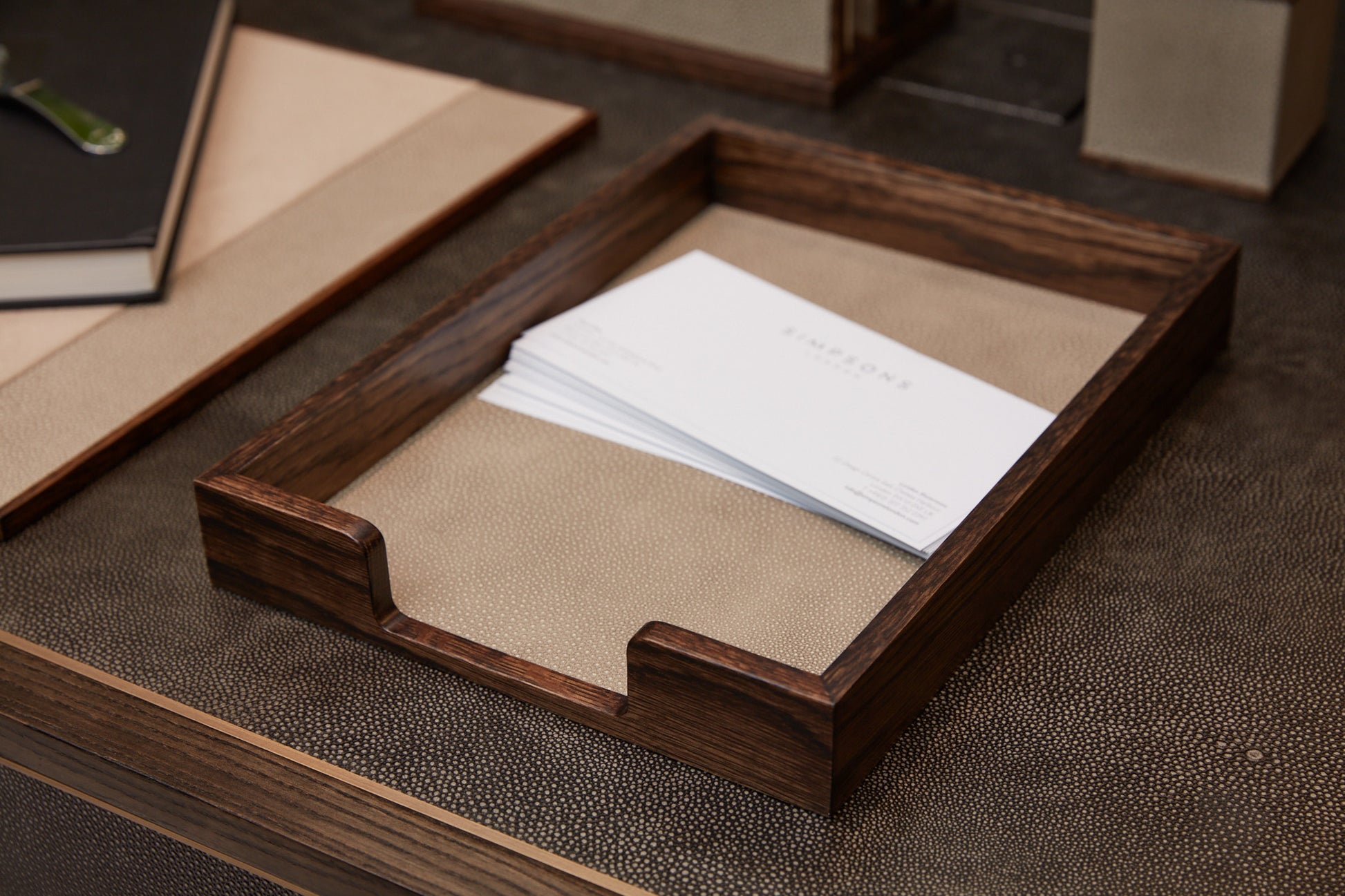 Our In Tray offers luxury storage for your paper needs as part of our Desk Collection. They are available in either a Smoke Shagreen and Dark Oak finish or Charcoal Shagreen with Dark Walnut finish and are lined in suede inside offering style to your office organisation.