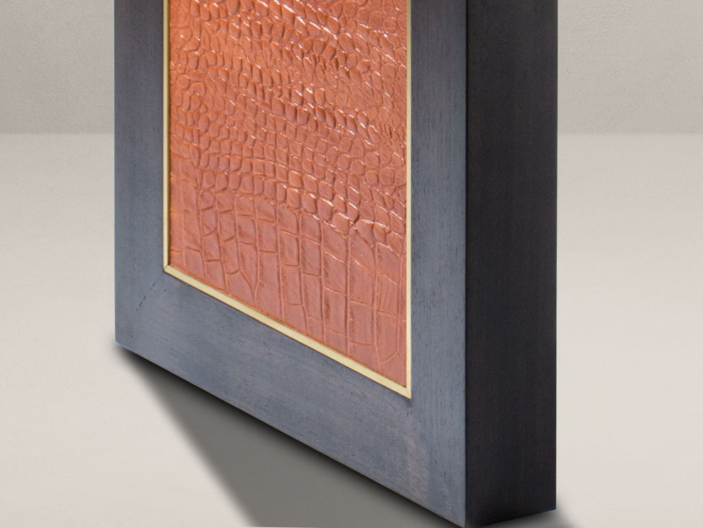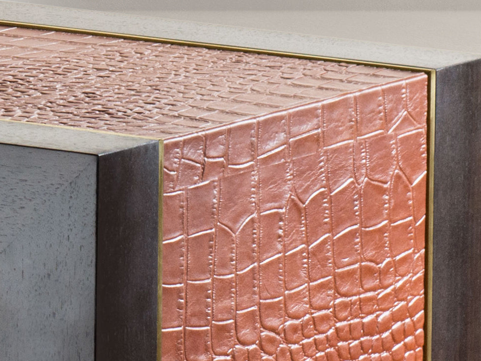 The refined luxury of the Kensington console table is showcased through its dark walnut frame and antique brass highlights, complemented by a croc leather inlay. Evoking a distinctly Simpsons look, this piece makes a bold statement in any space.