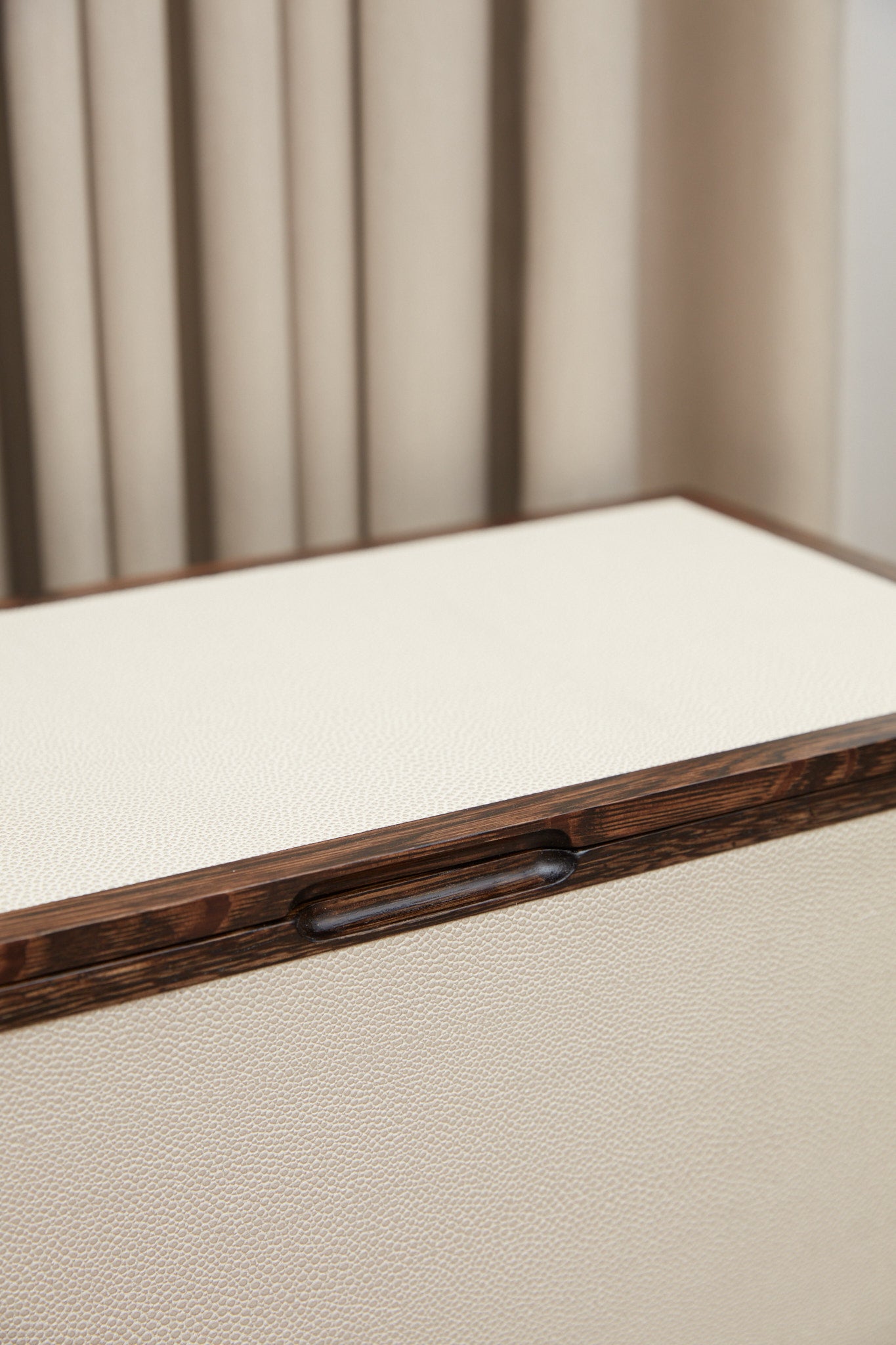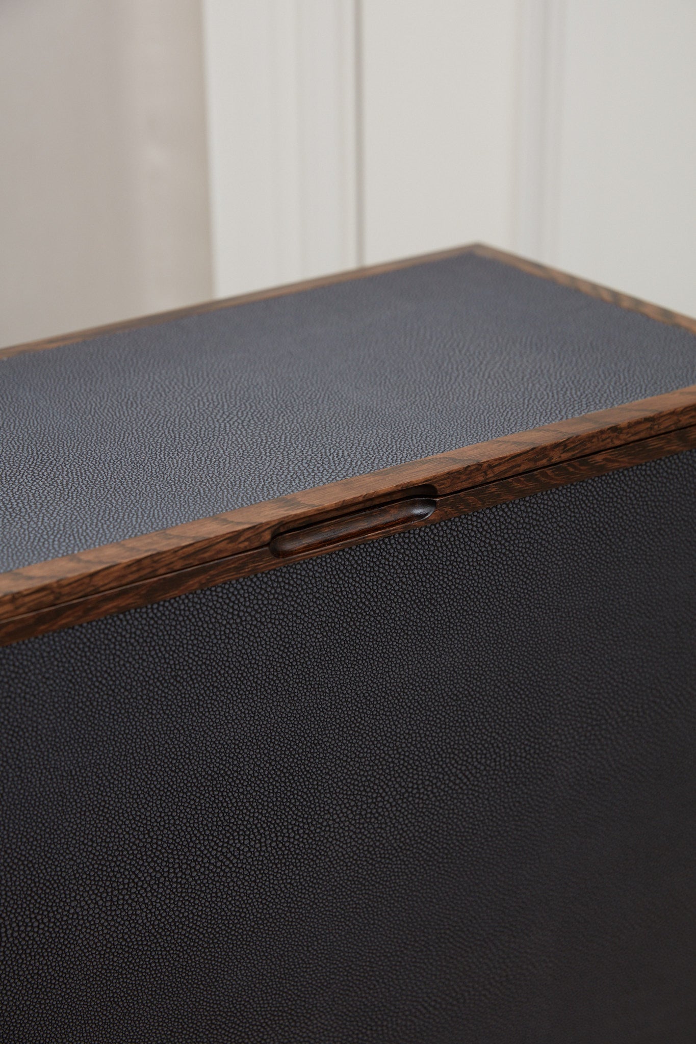 Our Laundry Bin offers an elegant storage for any bathroom or bedroom. Featuring Dark Oak trim with either a Navy Shagreen or Peal Shagreen surround and a lid with antique brass hinges and delicate finger grooves for easy use.