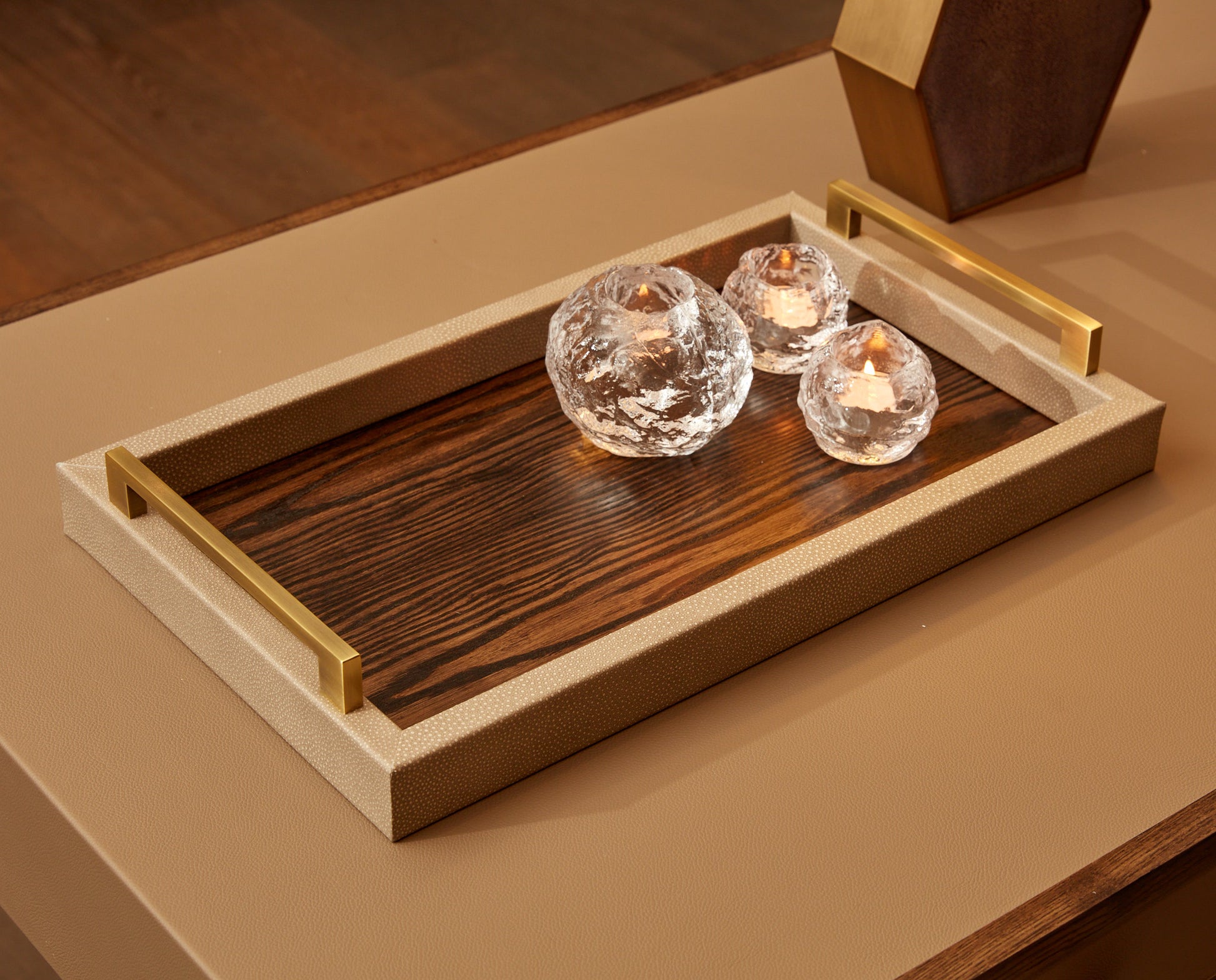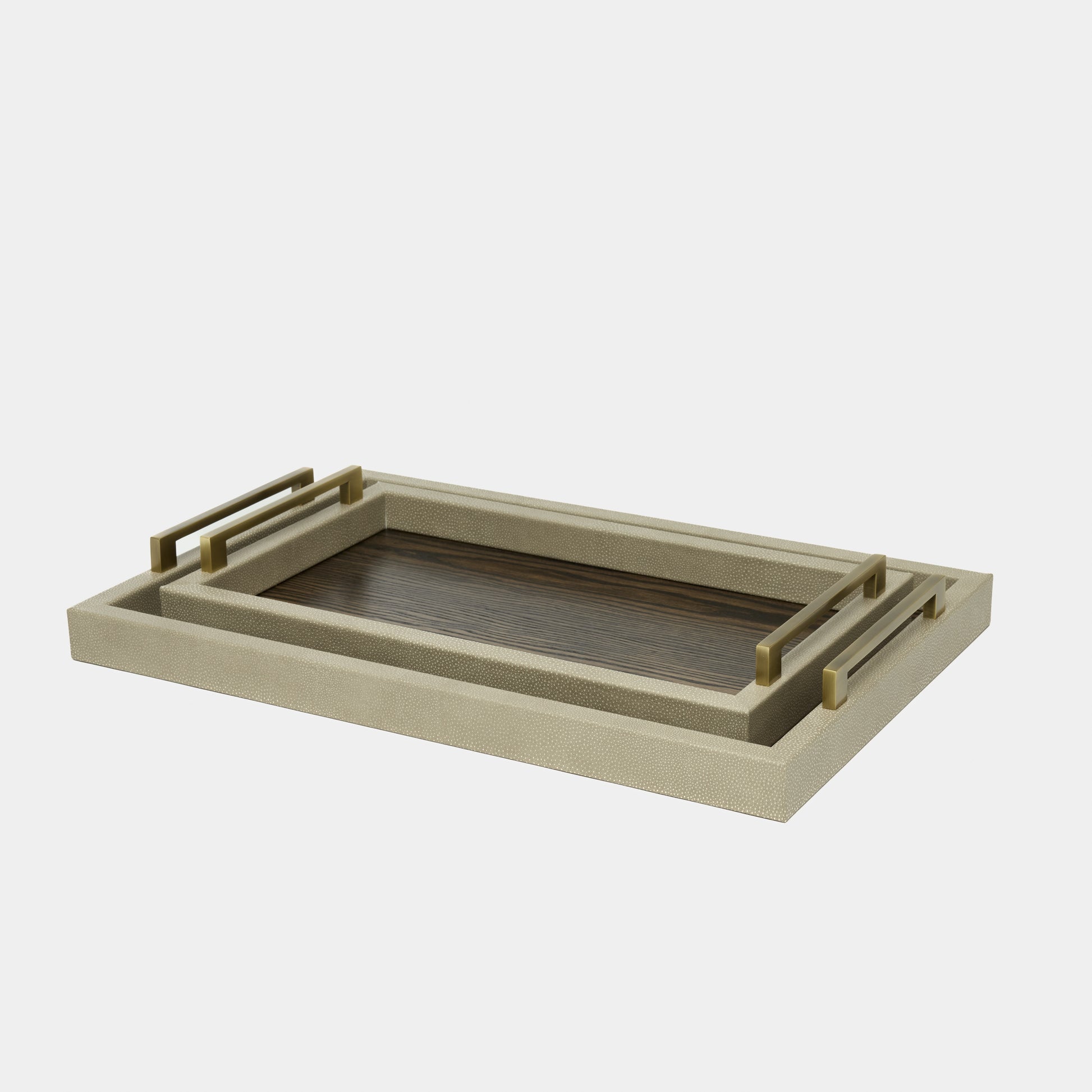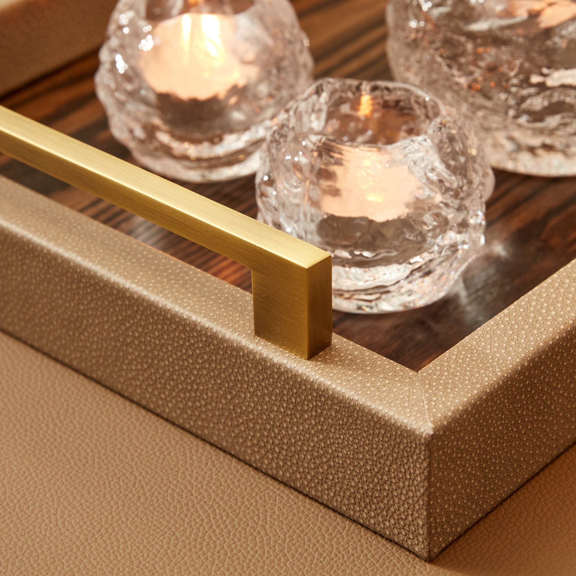 Our Leather Trays feature either a Smoke Shagreen or Charcoal Shagreen leather frame with a Dark Oak wooden base. All trays are accented with delicate antique brass handles and come in a variety of sizes, providing a decorative addition when perfectly placed on an ottoman or coffee table.