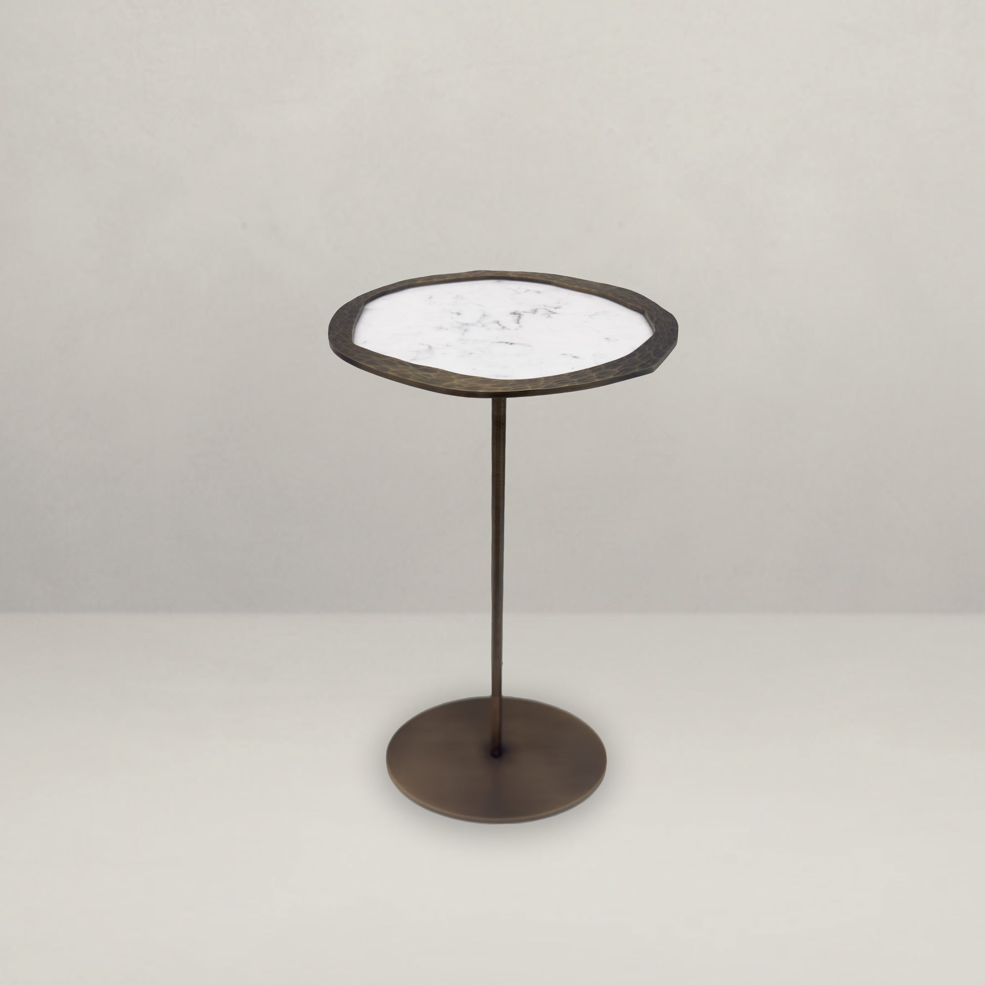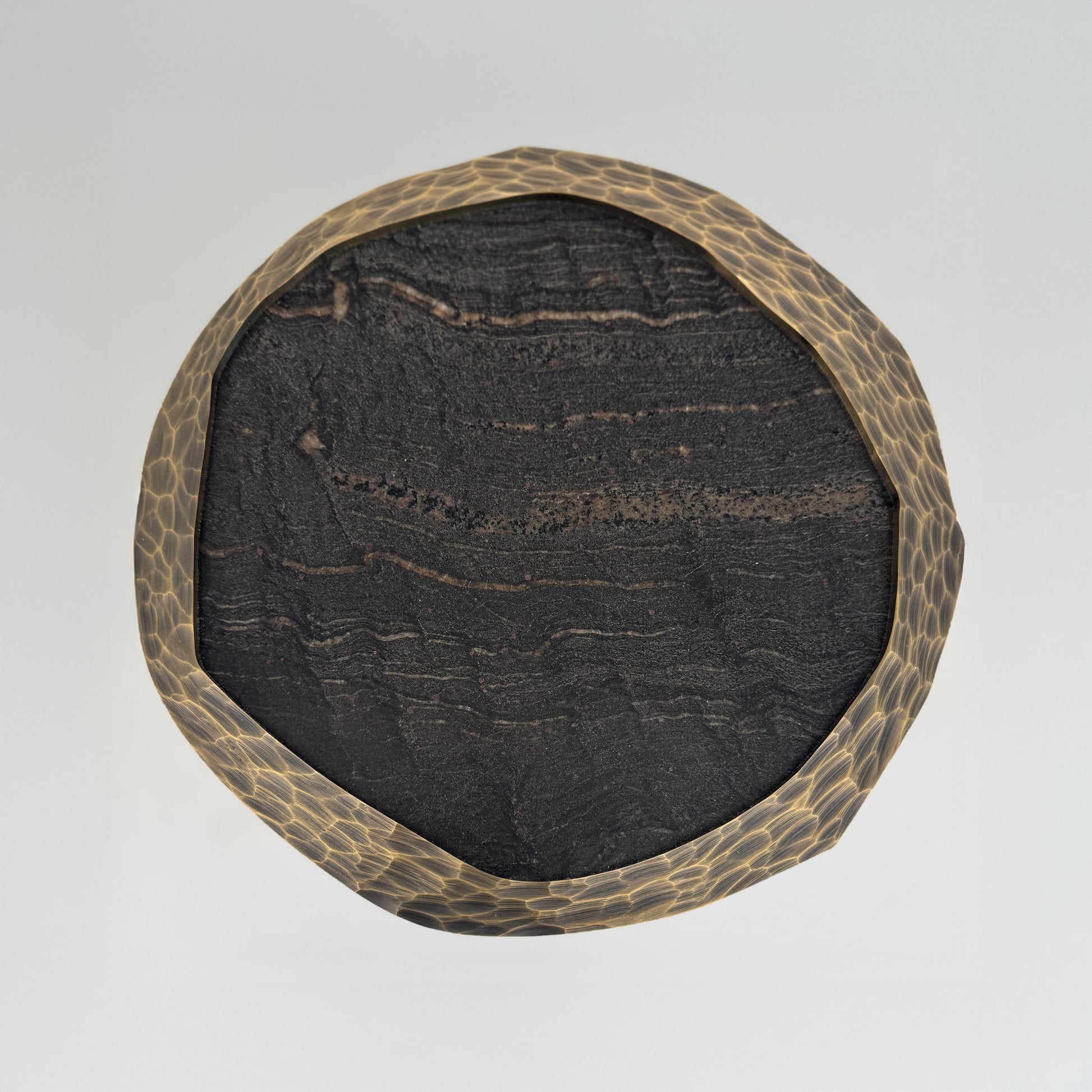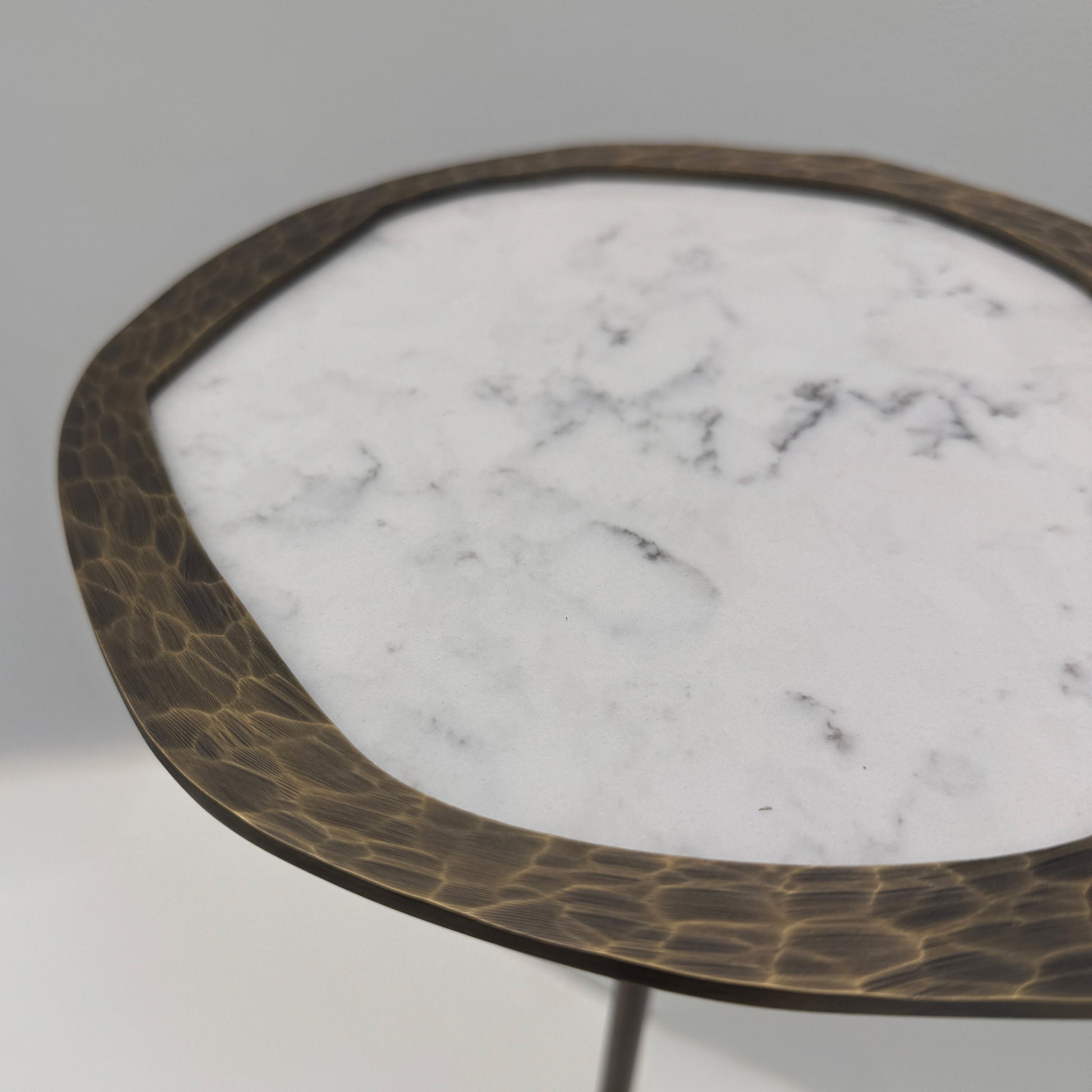 A study in quiet contrast, the Lugano side tables feature an organic silhouette stone top, framed by a hand-feathered brass surround, and a refined brass base.