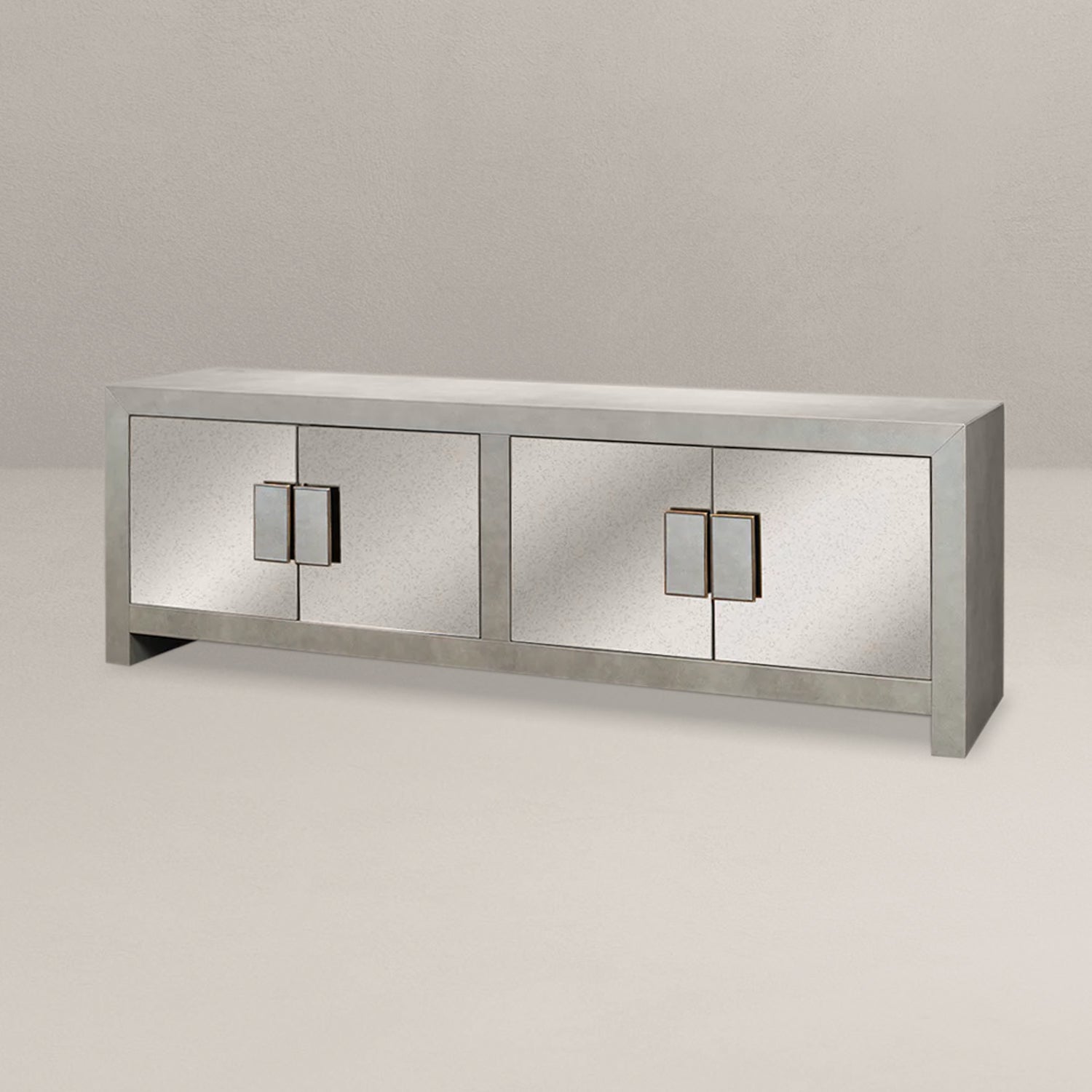 The Neptune Double Sideboard offers modern opulence. Upholstered in leather with Bianco Nero mirrored doors and inset leather brass handles.