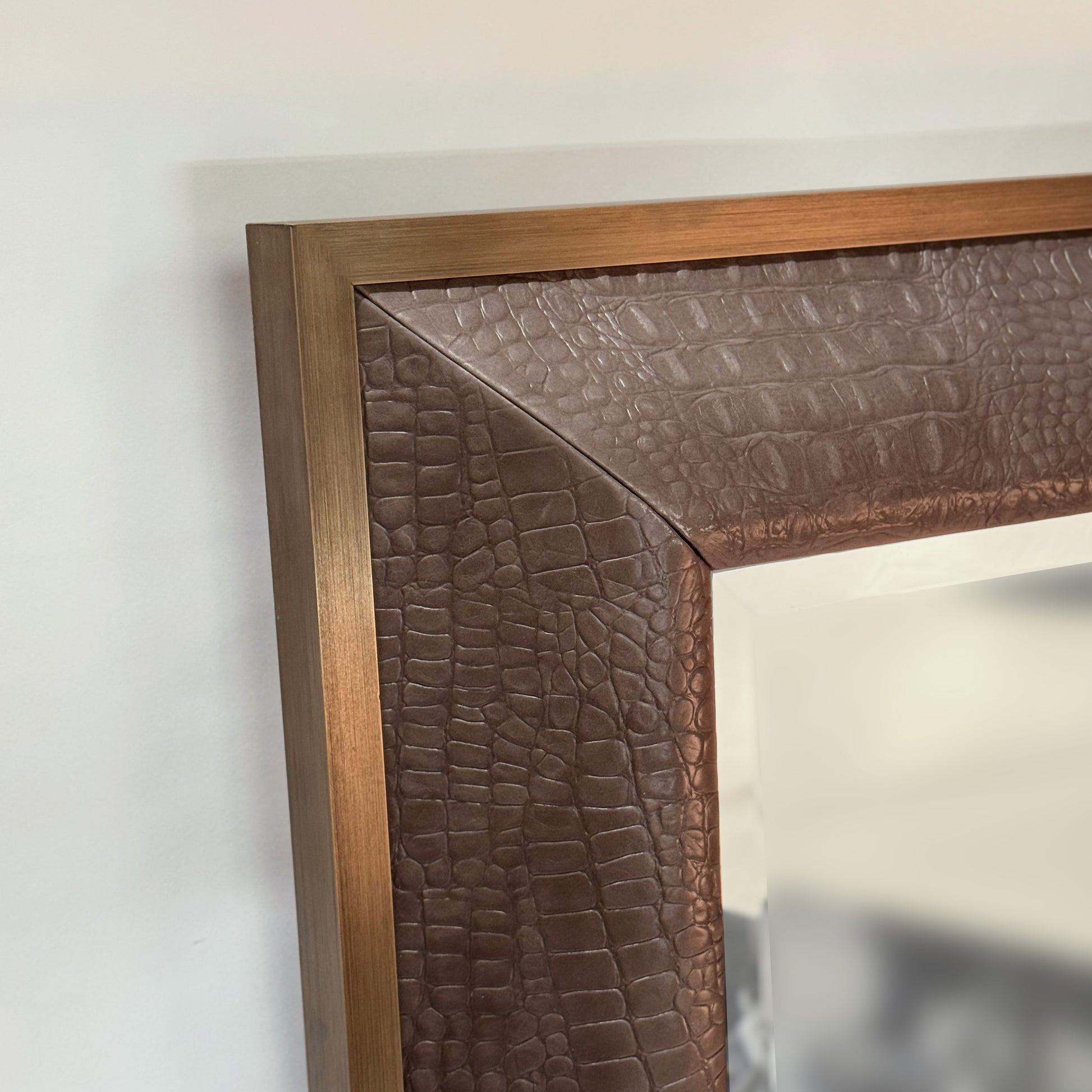 The Ogee Mirror features a solid antique brass outer moulding and a taupe croc leather design, adding a touch of classic sophistication to any room. With a centre bevelled mirror, this piece is both functional and stylish. Elevate your decor with this timeless addition.