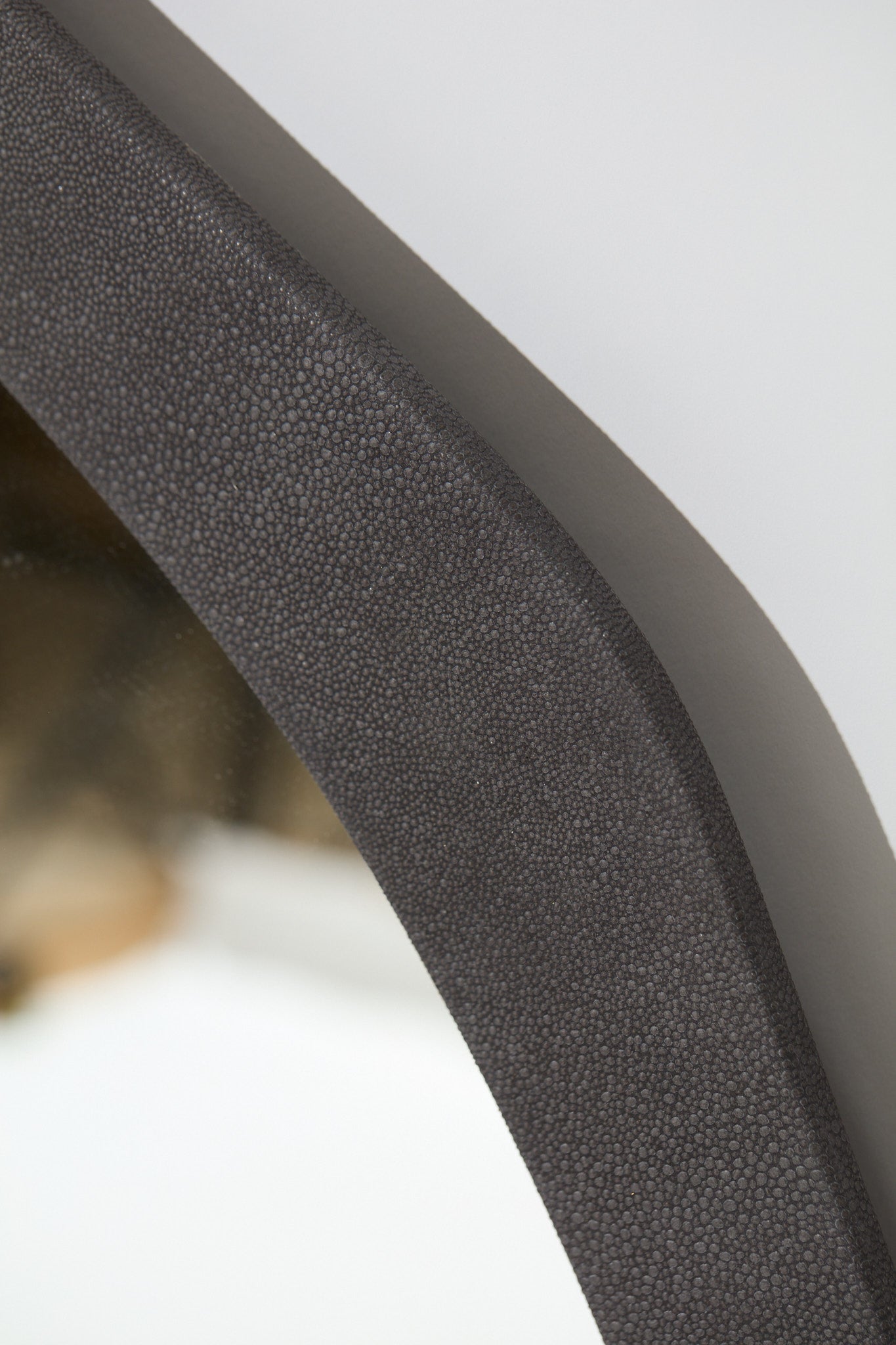 The Lugano mirror features an organic shape that offers a striking visual appeal. The central silver mirror is wrapped in a Charcoal Shagreen. The Lugano Wrapped is available with or without brass hammered details.