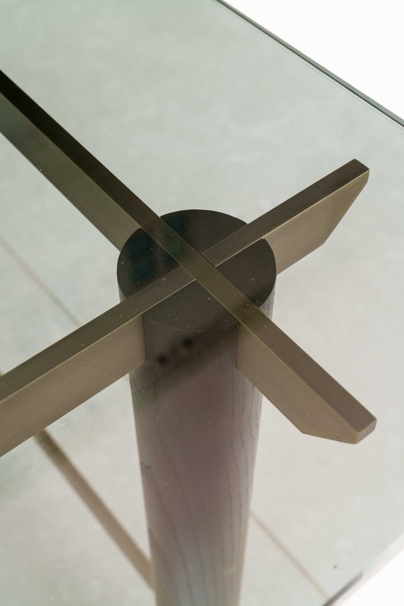 The Palmyra coffee table is inspired by the ancient columns of Palmyra. A four pillar base made of dark walnut, supports a tinted slim glass top, featuring refined antique brass structural accents.