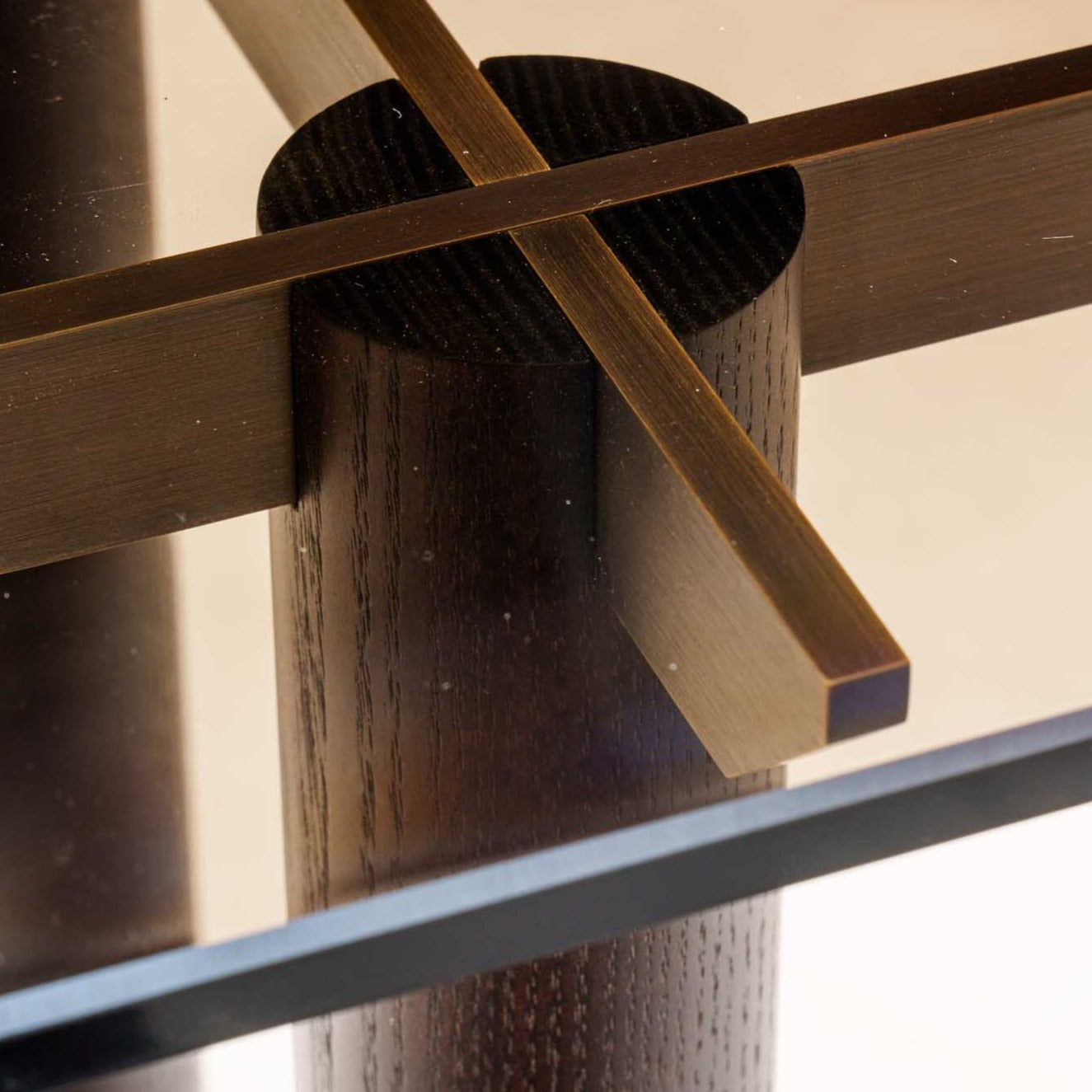 The Palmyra console table is inspired by the ancient columns of Palmyra. A four pillar base of dark walnut, supports a tinted slim glass top, featuring refined antique brass structural accents.