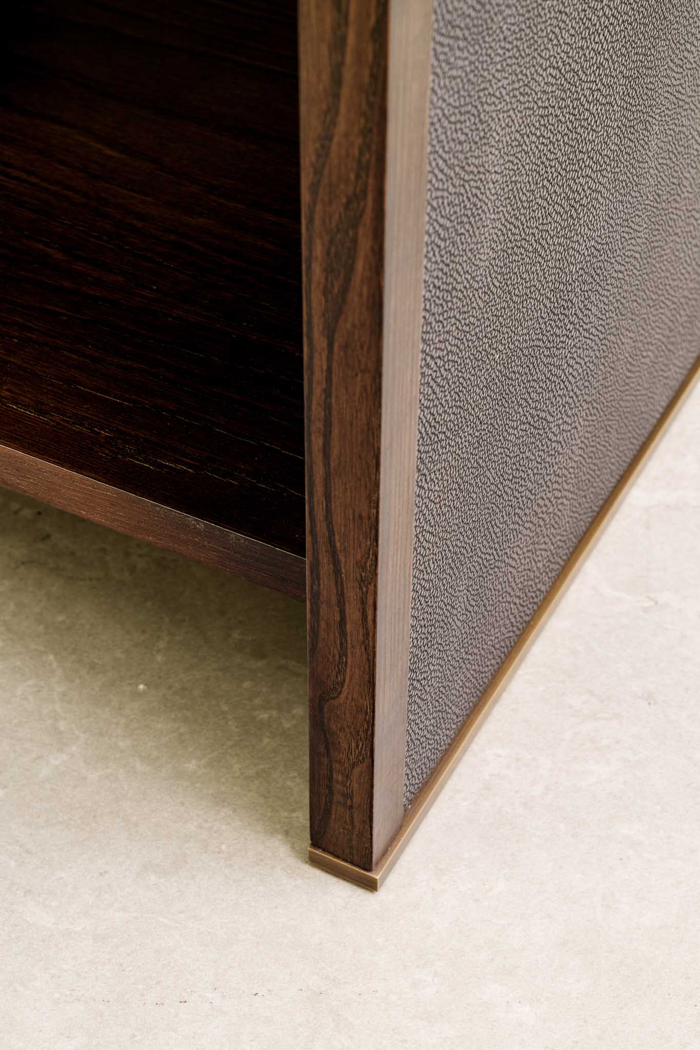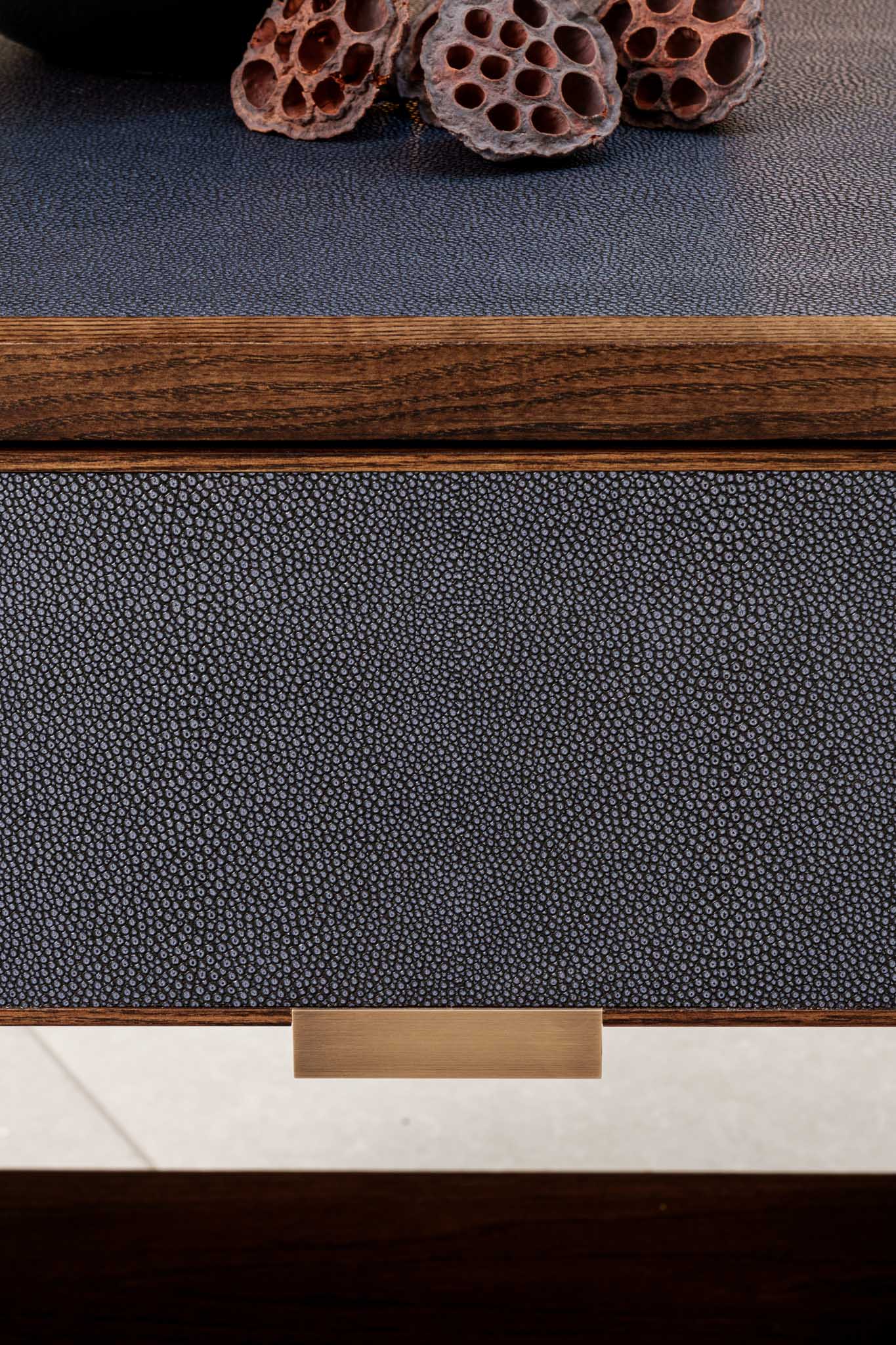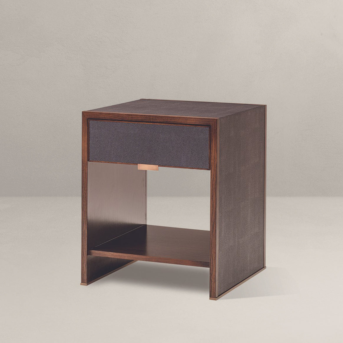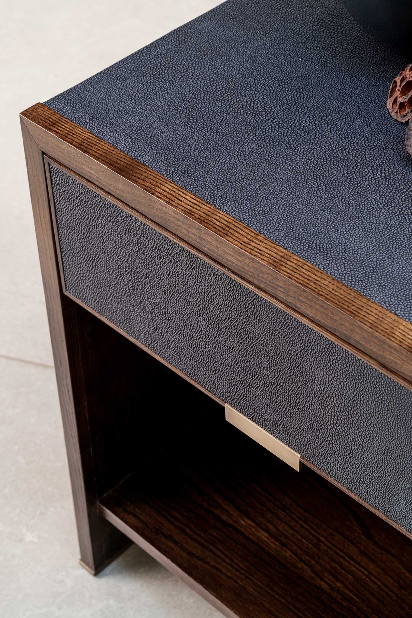 The Richmond Bedside Table offers a classic Simpsons aesthetic, with a dark oak frame paired with Shagreen faux leather and antique brass details.