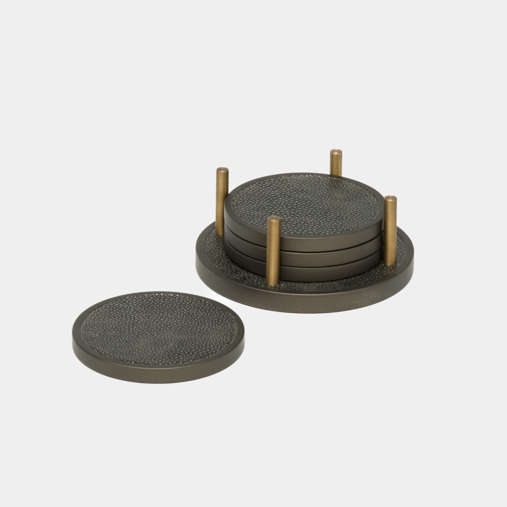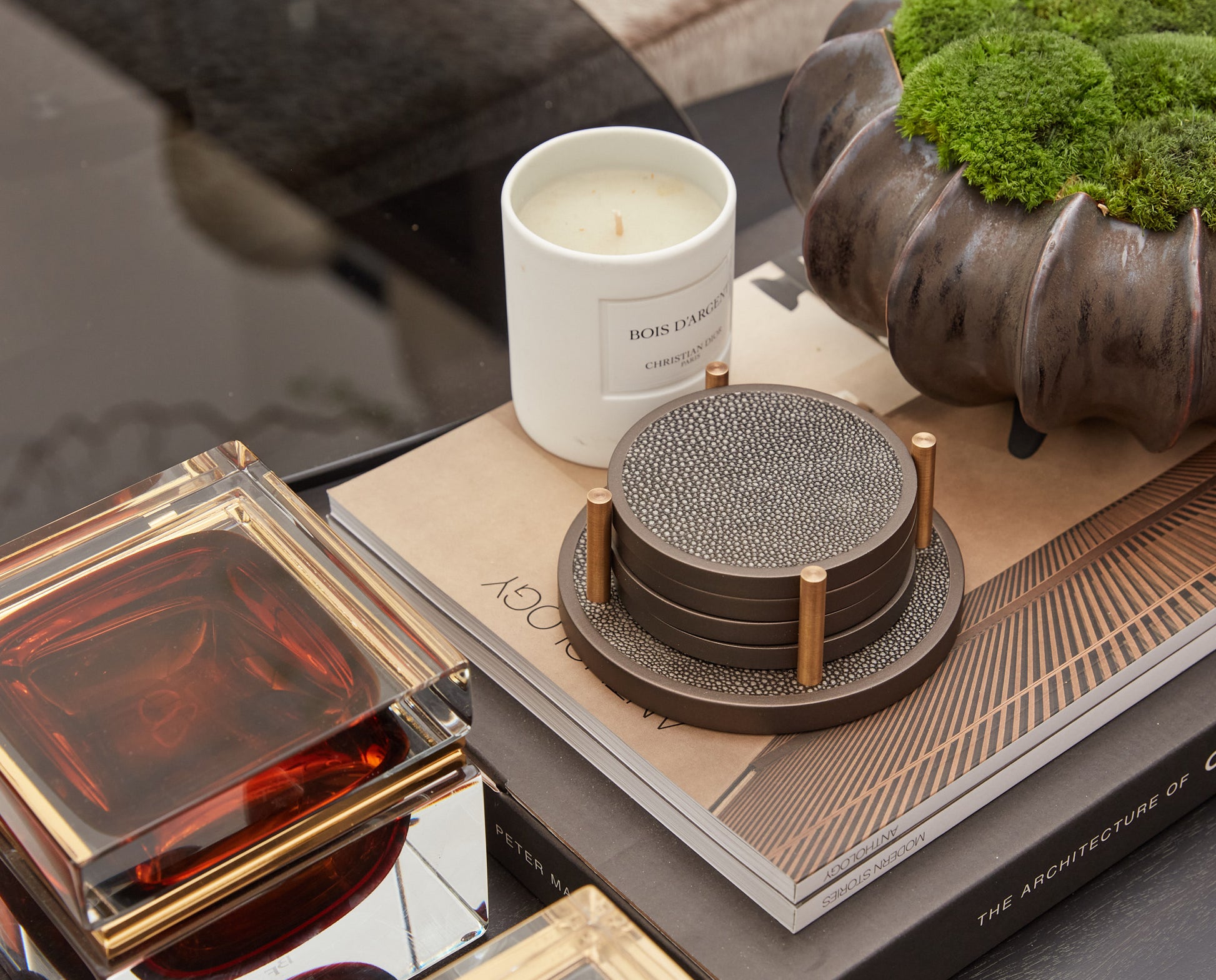 Our Round Coasters offers a luxury placement for cups and glasses, protecting your home surfaces. They are available in either an inlaid Smoke Shagreen or Charcoal Shagreen with a Black & Bronze painted surround and come in a set of four with a stunning holder accented in antique brass.