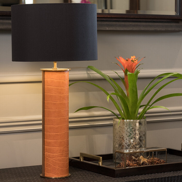 The Seraph Lamp features a cylindrical form crafted in grey prisma leather with bold antique brass accents lending it a timeless appeal.