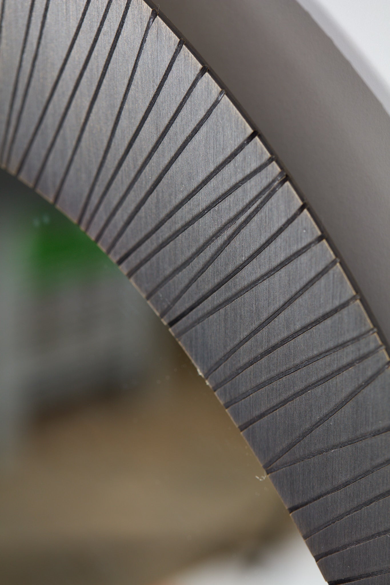 The Small Como Mirror showcases a striking oval antique brass bronze frame with hand etched frame, surrounding a silver glass mirror, and optional warm backlighting.